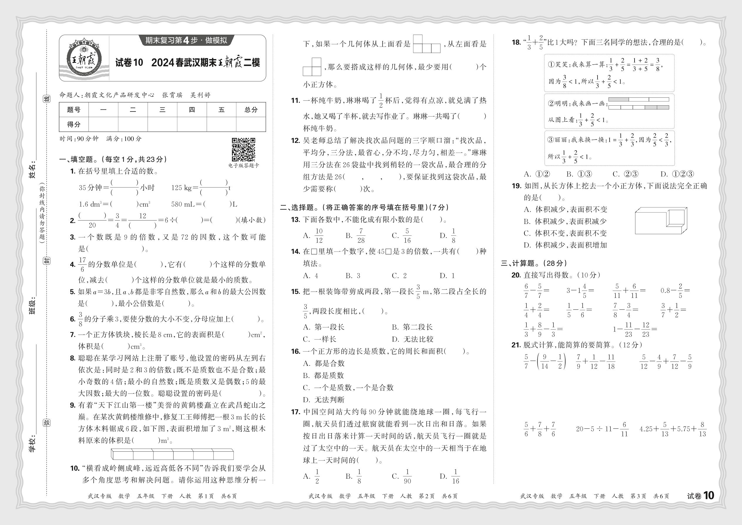 2024春下册五年级数学人教版 湖北武汉期末王朝霞二模