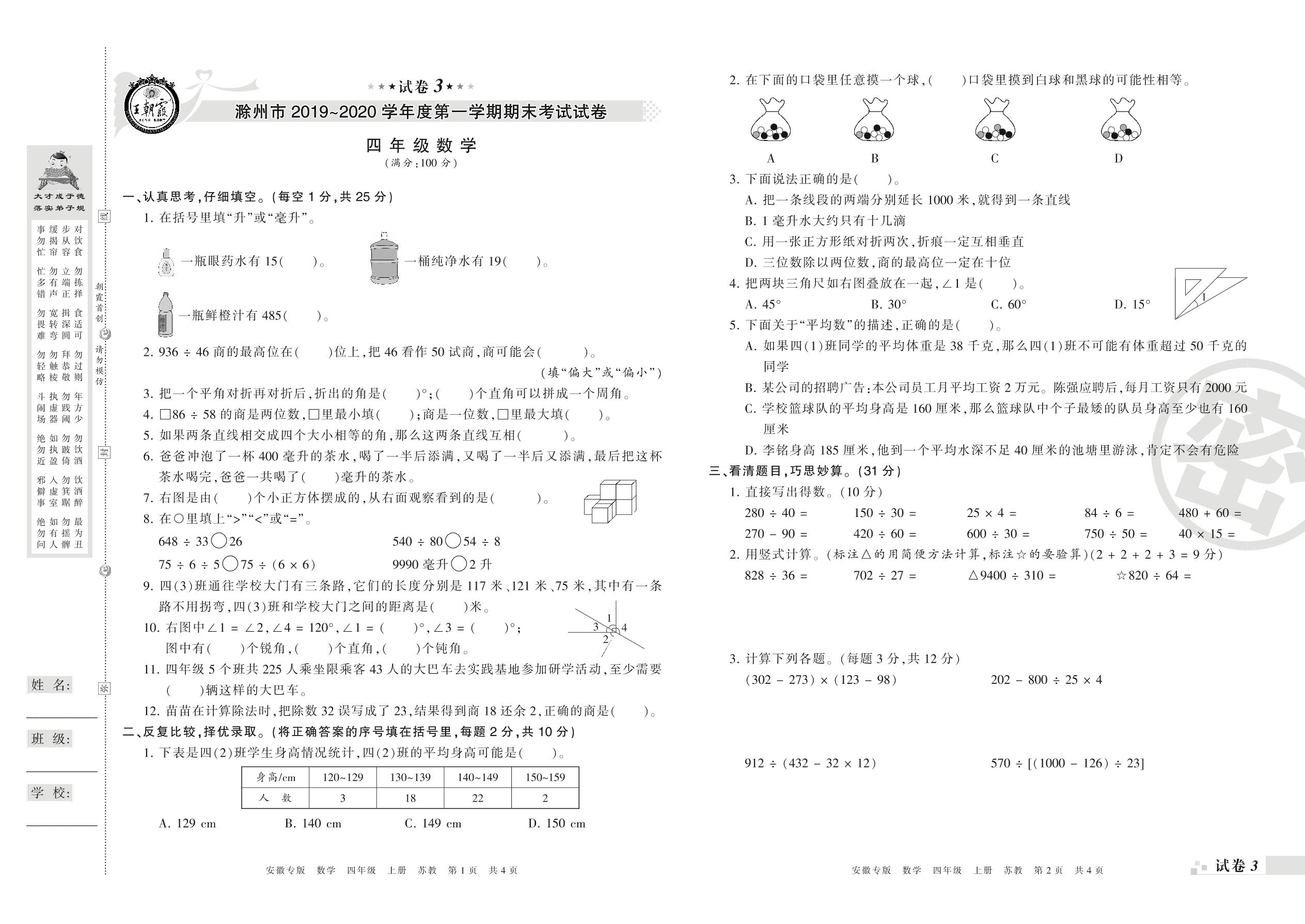 2019-2020学年第一学期滁州市四年级数学试卷(苏教版)【3】