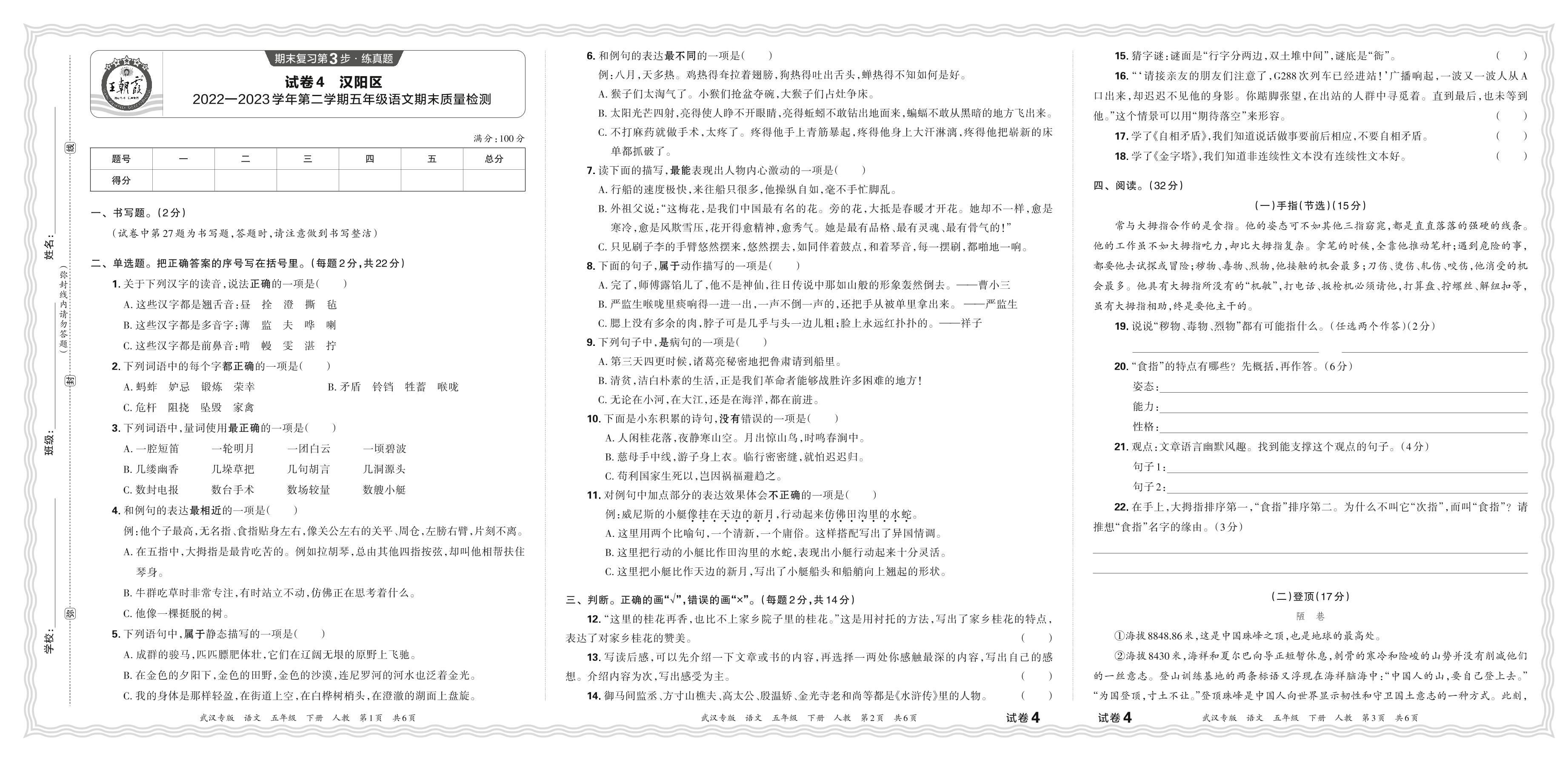 湖北省武汉市汉阳区2022—2023学年第二学期五年级语文期末质量检测(人教版)【4】