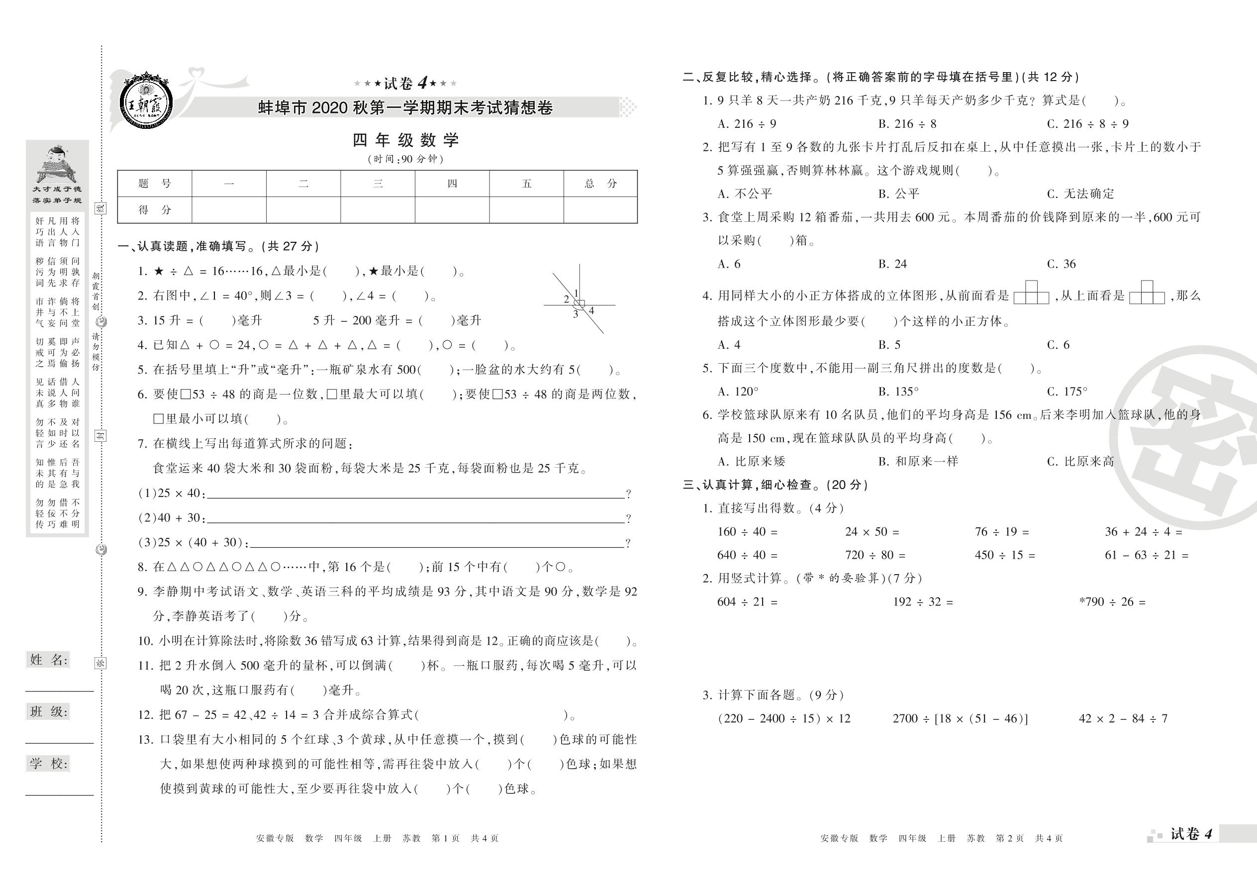 2019-2020学年第一学期蚌埠市四年级数学试卷(苏教版)【4】