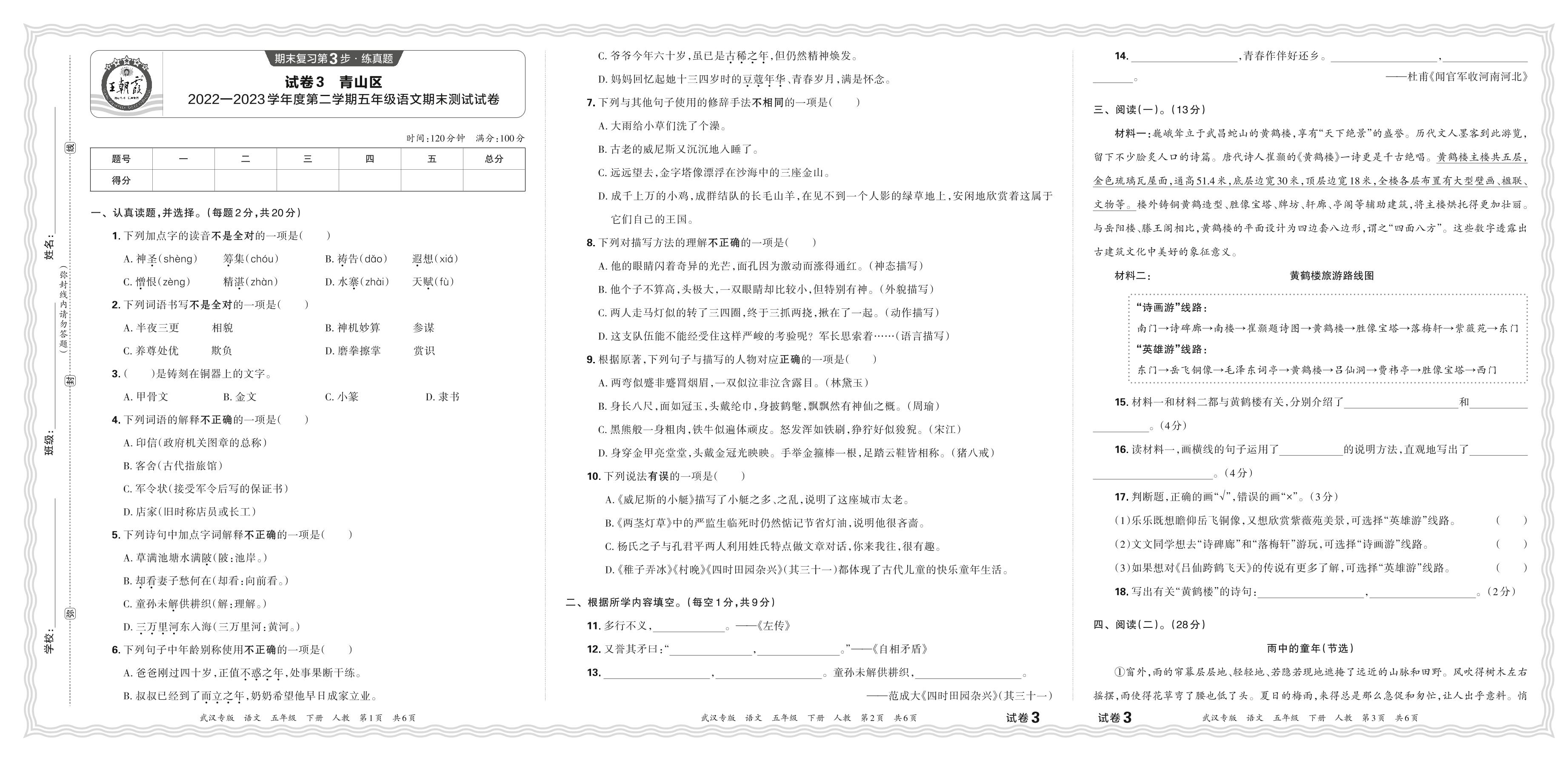 湖北省武汉市青山区2022—2023学年度第二学期五年级语文期末测试试卷(人教版)【3】
