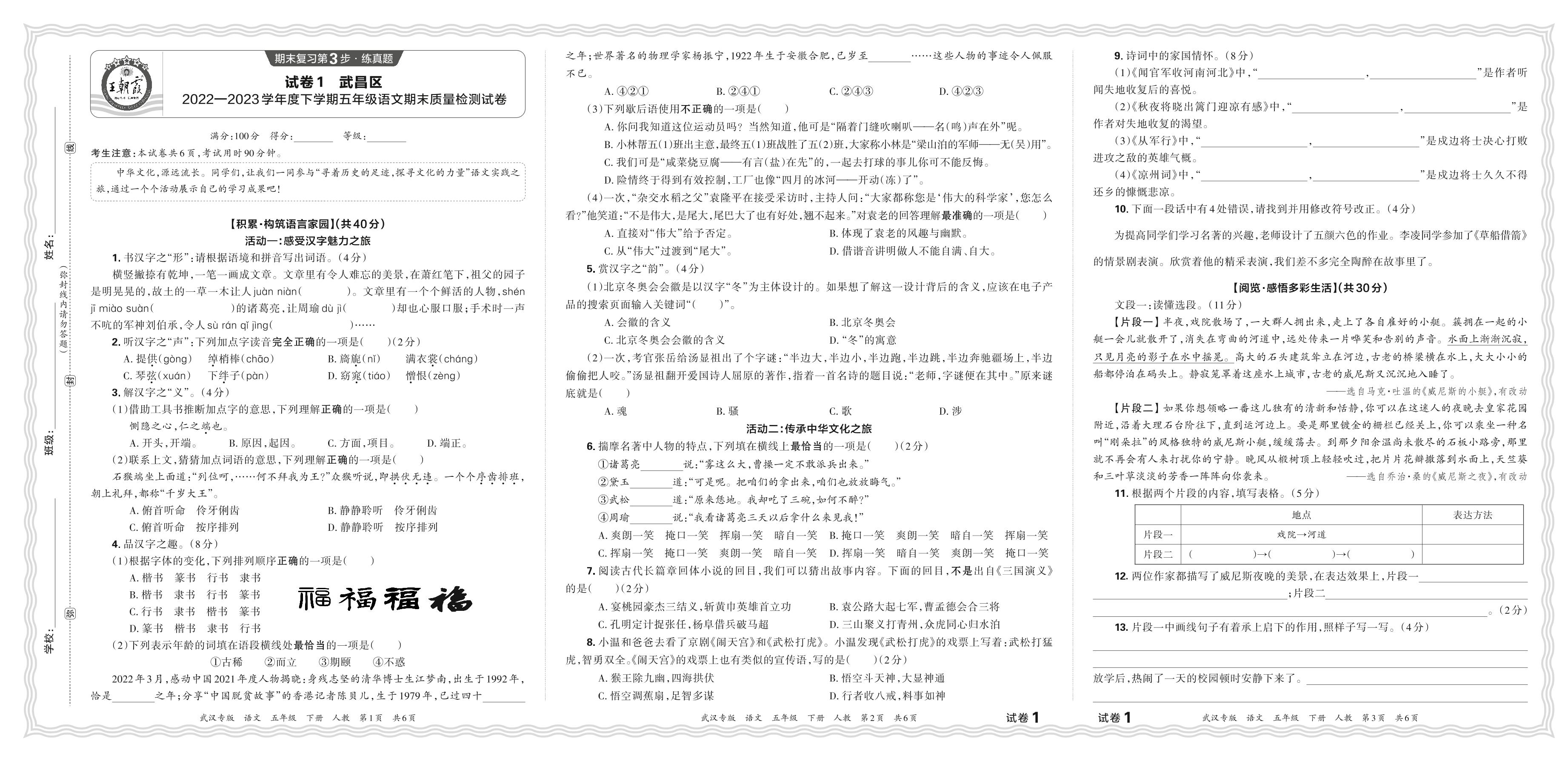 湖北省武汉市武昌区2022—2023学年度下学期五年级语文期末质量检测试卷(人教版)【1】