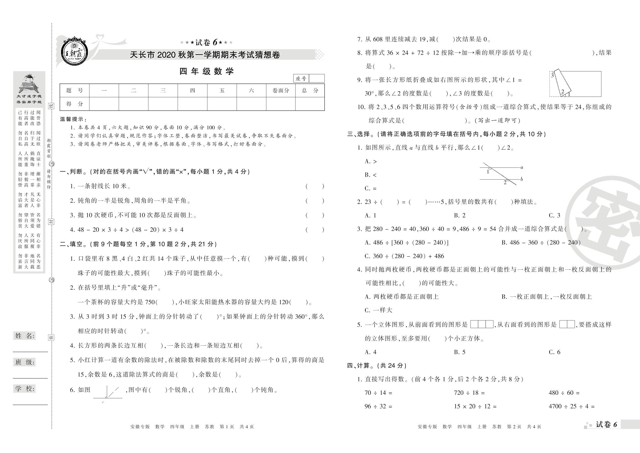 2019-2020学年第一学期天长市四年级数学试卷(苏教版)【6】