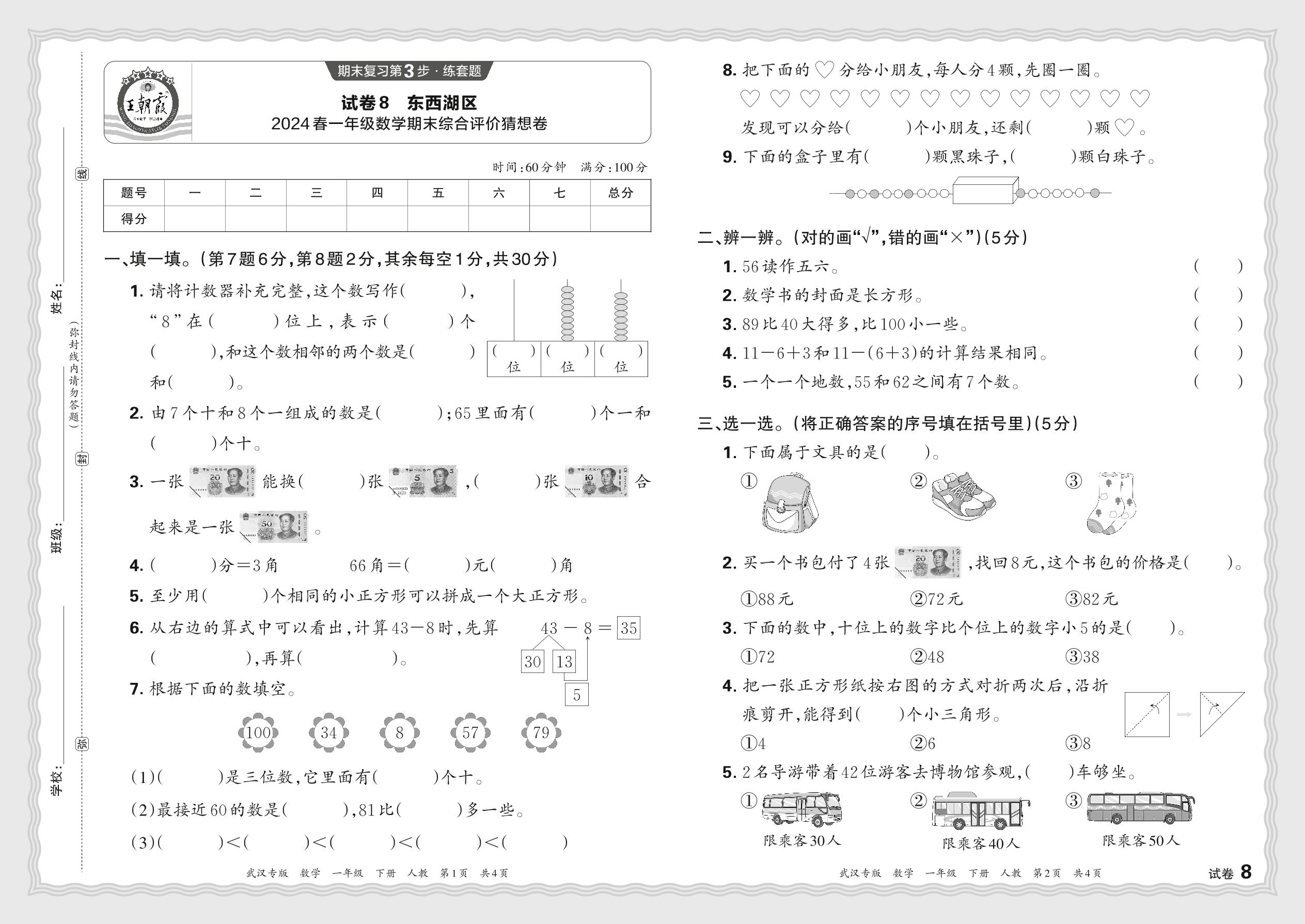 湖北省武汉市东西湖区2024春一年级数学期末综合评价猜想卷(人教版)【8】