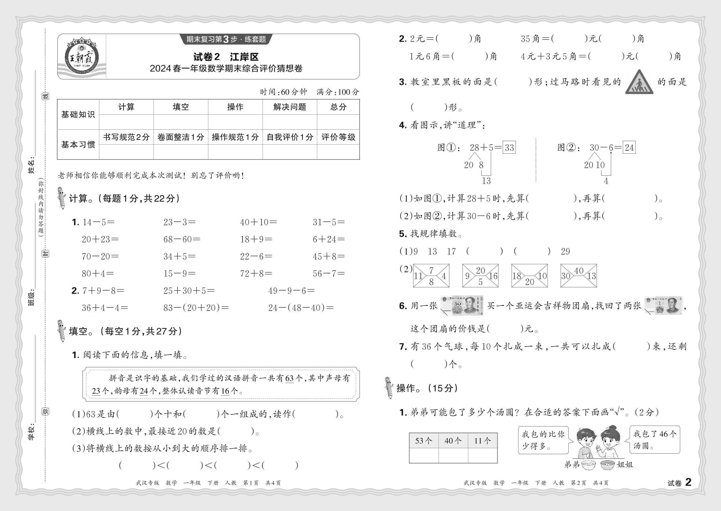 湖北省武汉市江岸区2024春一年级数学期末综合评价猜想卷(人教版)【2】