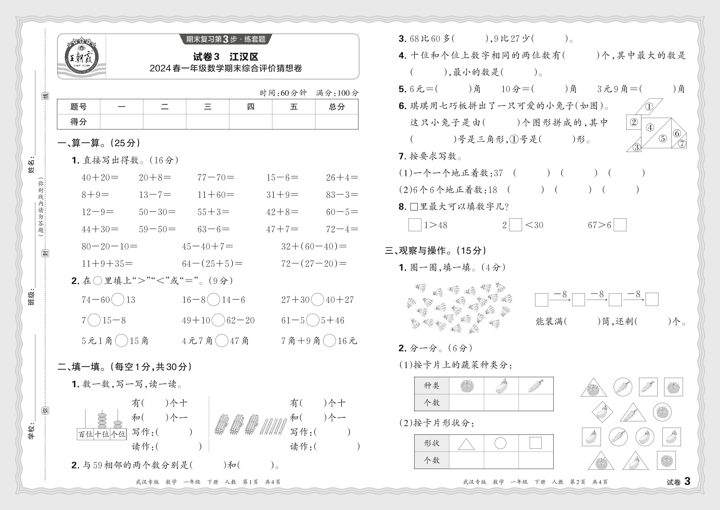 湖北省武汉市江汉区2024春一年级数学期末综合评价猜想卷(人教版)【3】