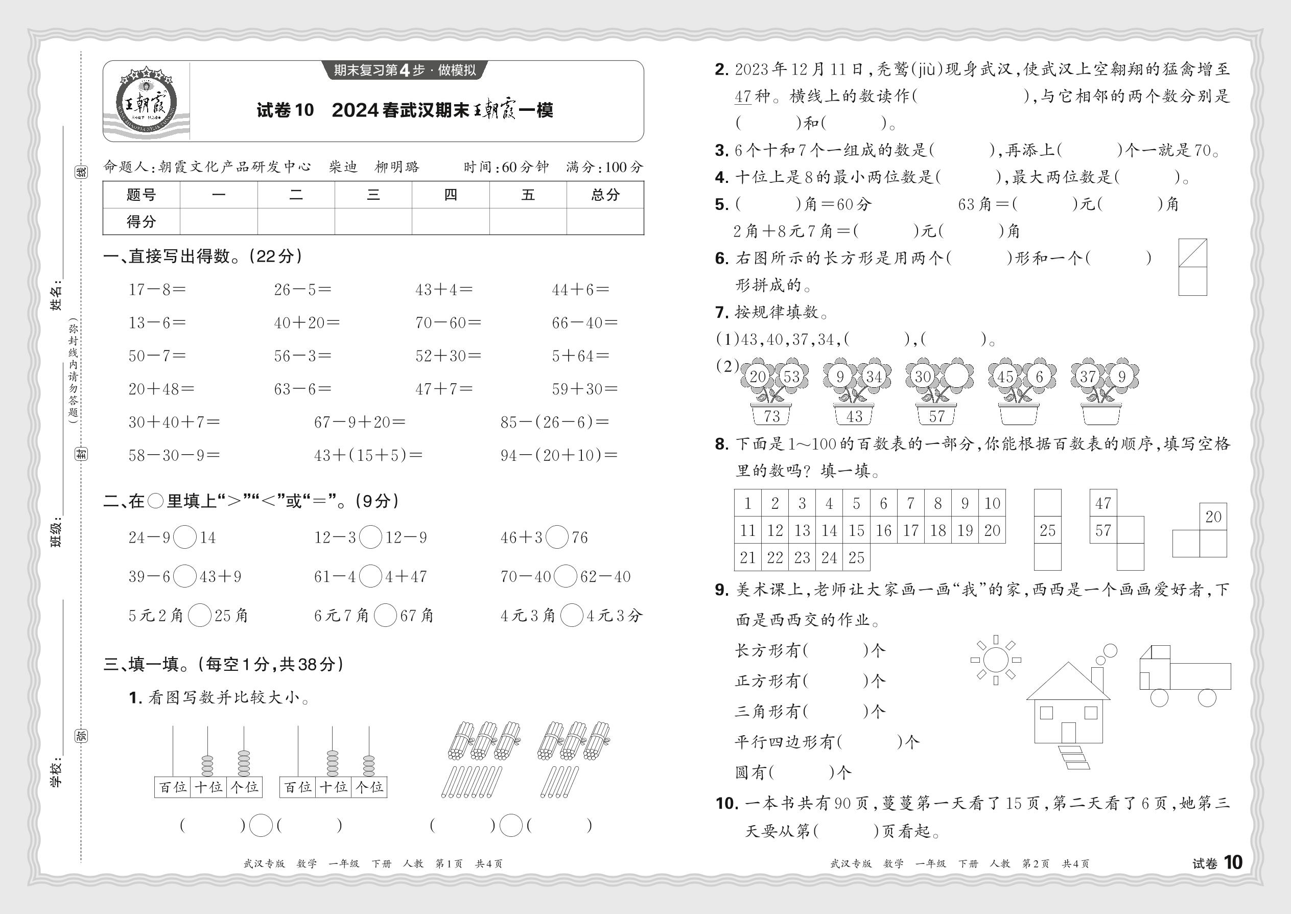 2024春下册一年级数学人教版 湖北武汉期末王朝霞一模【10】