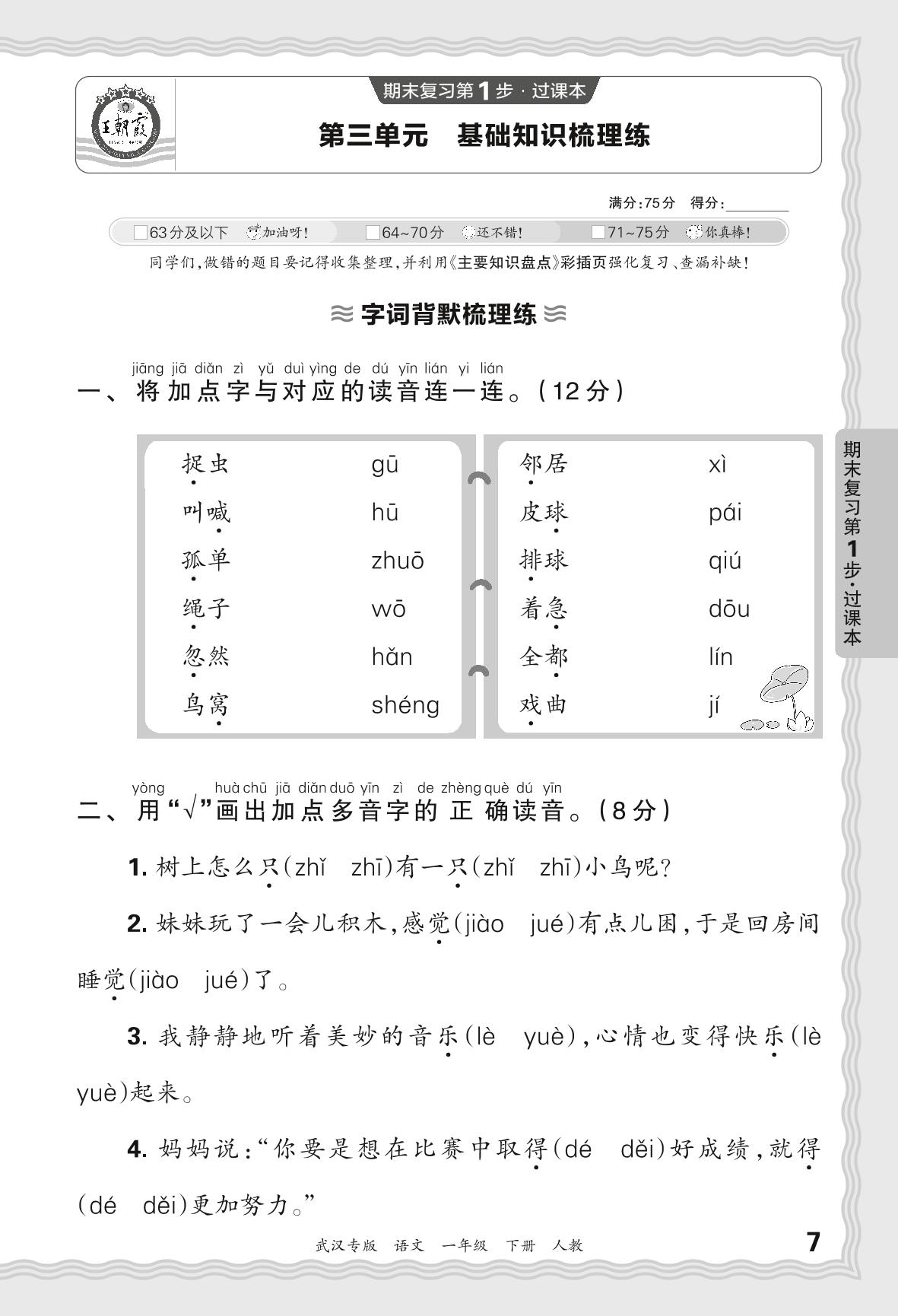 2024春下册一年级语文人教版 期末过课本武汉版·第三单元基础知识梳理练