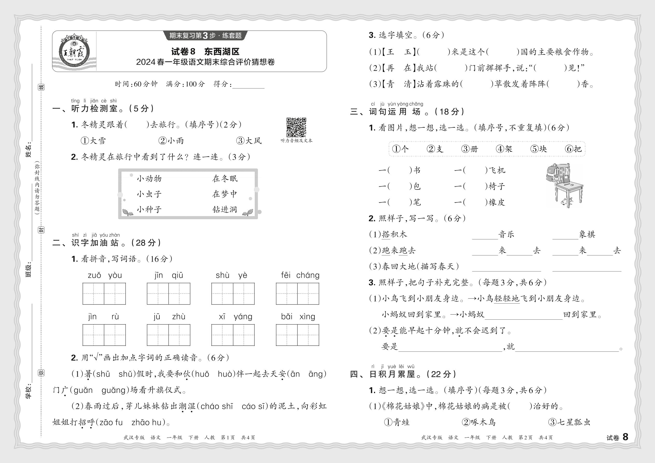 湖北省武汉市东西湖区2024春一年级语文期末综合评价猜想卷(人教版)【8】