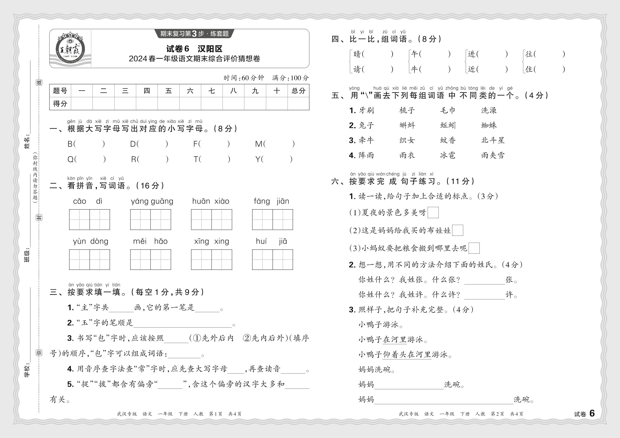 湖北省武汉市汉阳区2024春一年级语文期末综合评价猜想卷(人教版)【6】