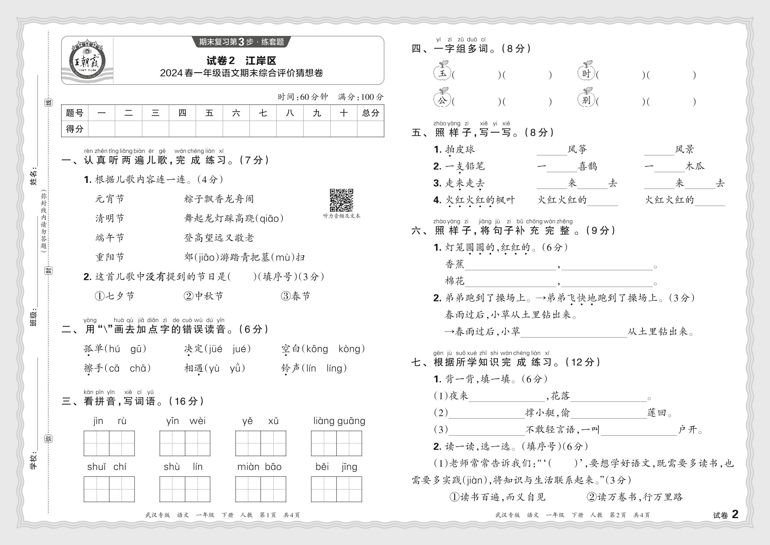 湖北省武汉市江岸区2024春一年级语文期末综合评价猜想卷(人教版)【2】