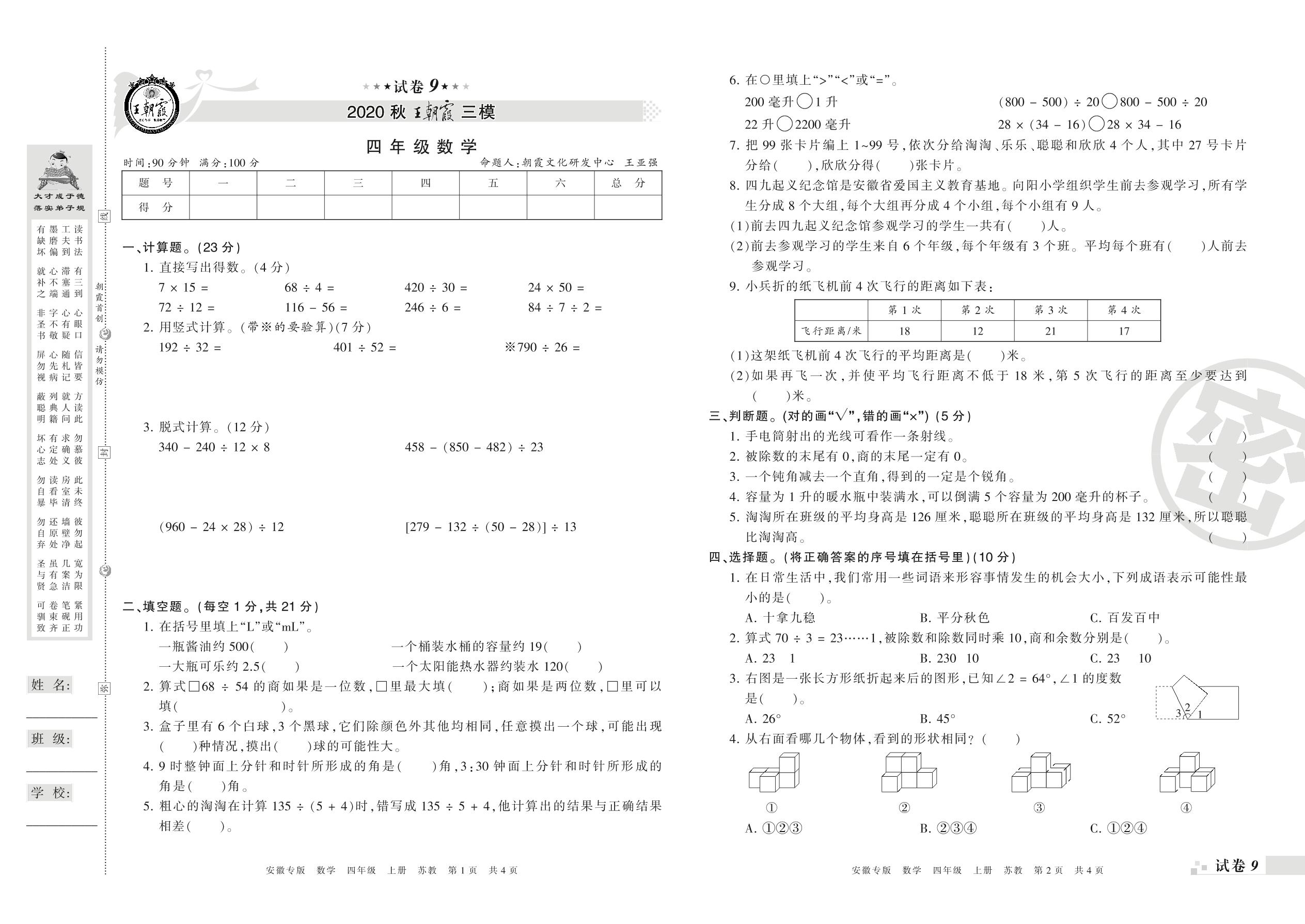 王朝霞期末模拟卷四年级上册数学(苏教版)_R210804141342【9】