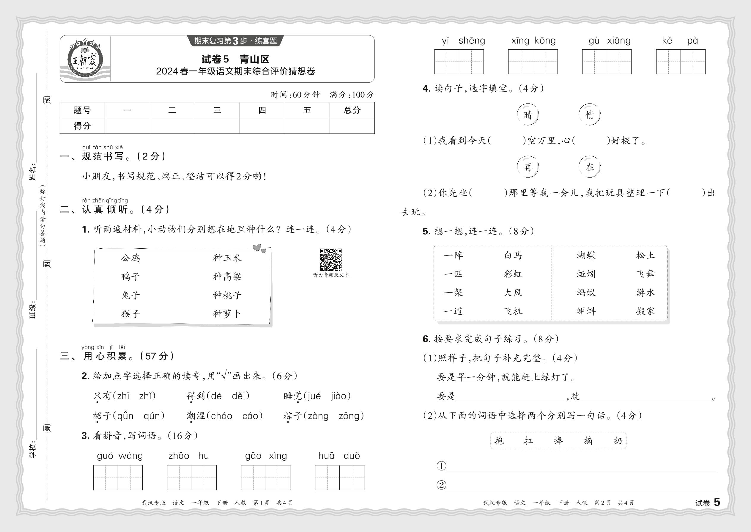 湖北省武汉市青山区2024春一年级语文期末综合评价猜想卷(人教版)【5】