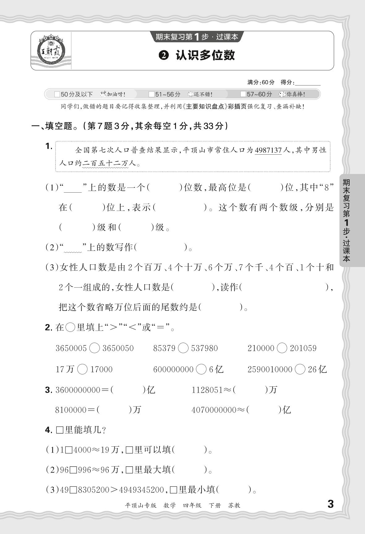 2024春下册四年级数学苏教版 期末过课本平顶山版·认识多位数【2】