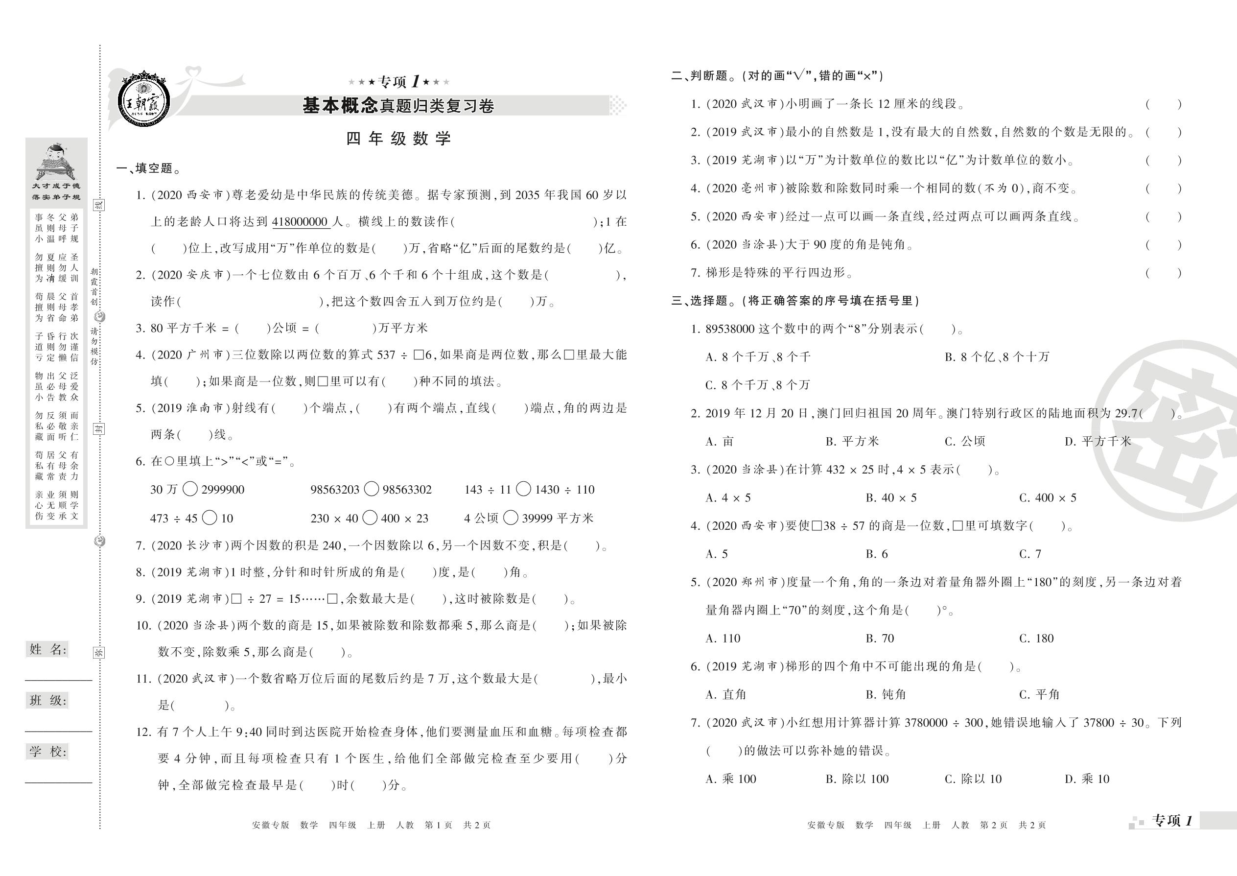 王朝霞期末专项卷——基本概念、计算真题归类复习四年级上册数学(人教版)_R210804141357【0】