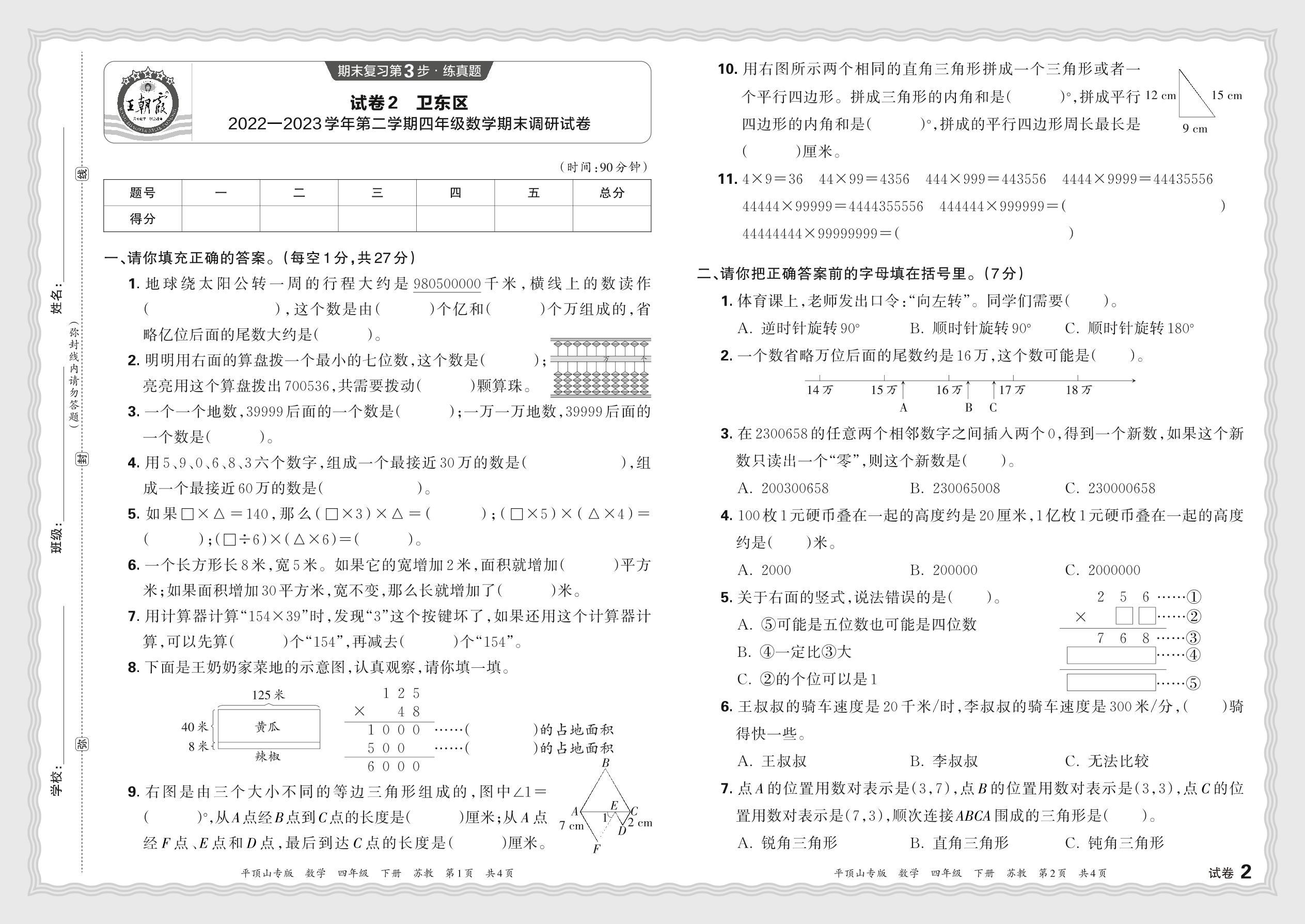 河南省平顶山市卫东区2022-2023学年第二学期四年级数学期末调研试卷(苏教版)【2】