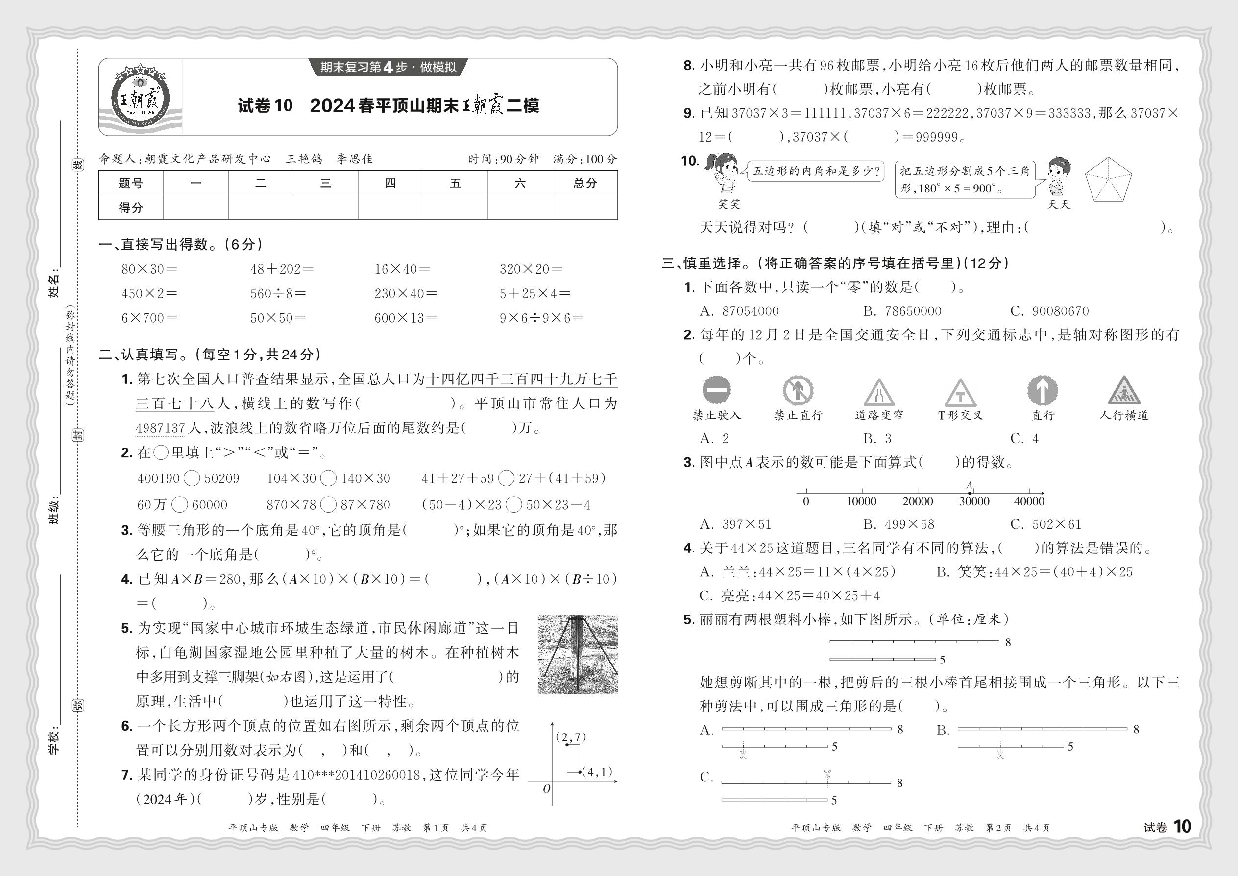 2024春下册四年级数学苏教版 河南平顶山期末王朝霞二模【10】