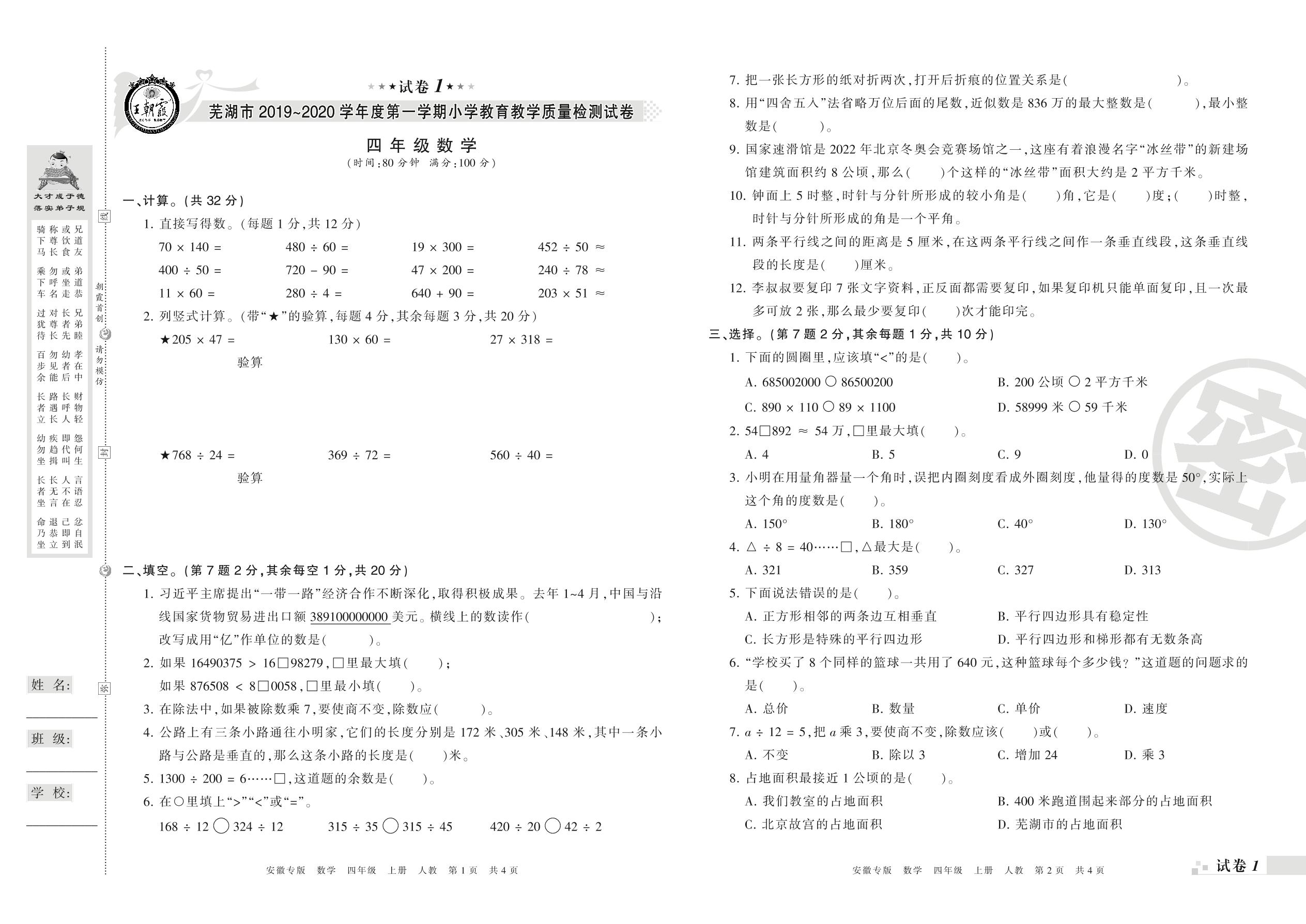 2019-2020学年第一学期芜湖市四年级数学试卷(人教版)【1】