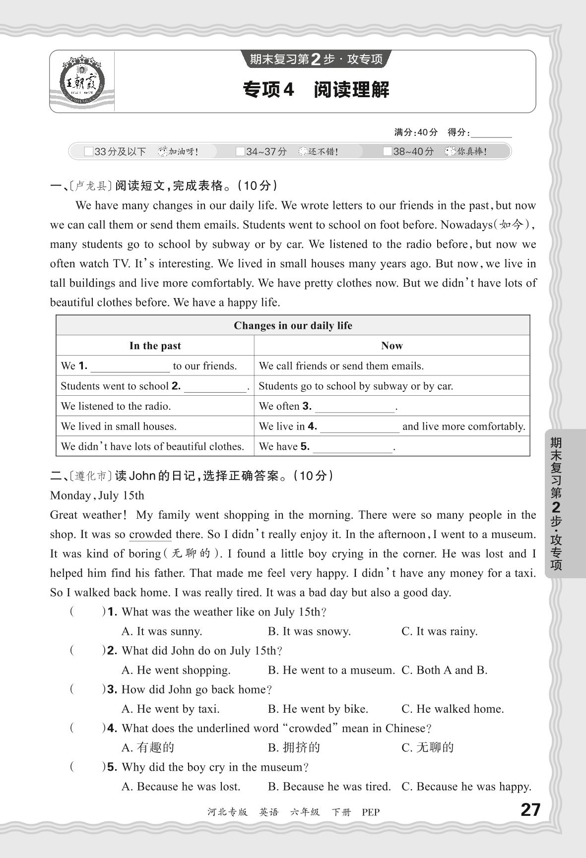 2024春下册六年级英语人教PEP版 期末专项卷河北版·阅读理解【4】