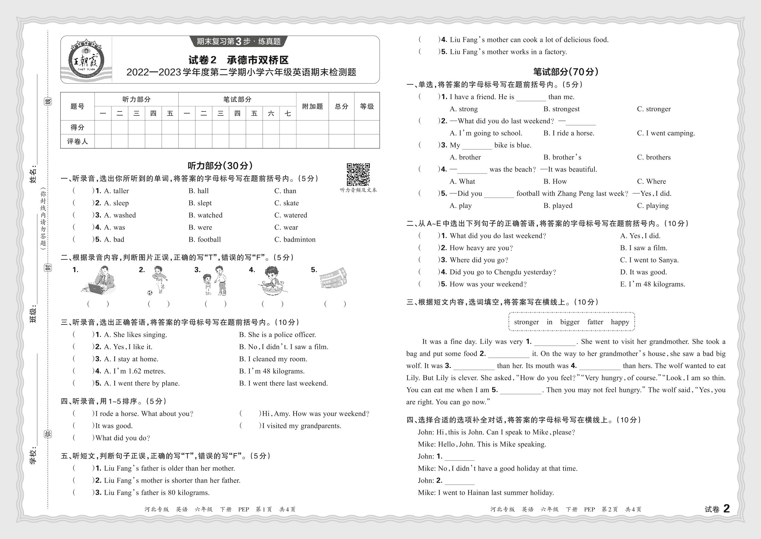 河北省承德市双桥区2022—2023学年度第二学期小学六年级英语期末检测题(人教PEP版)【2】