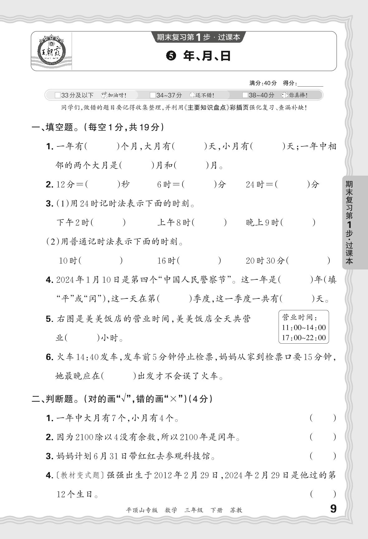 2024春下册三年级数学苏教版 期末过课本平顶山版·年、月、日【5】