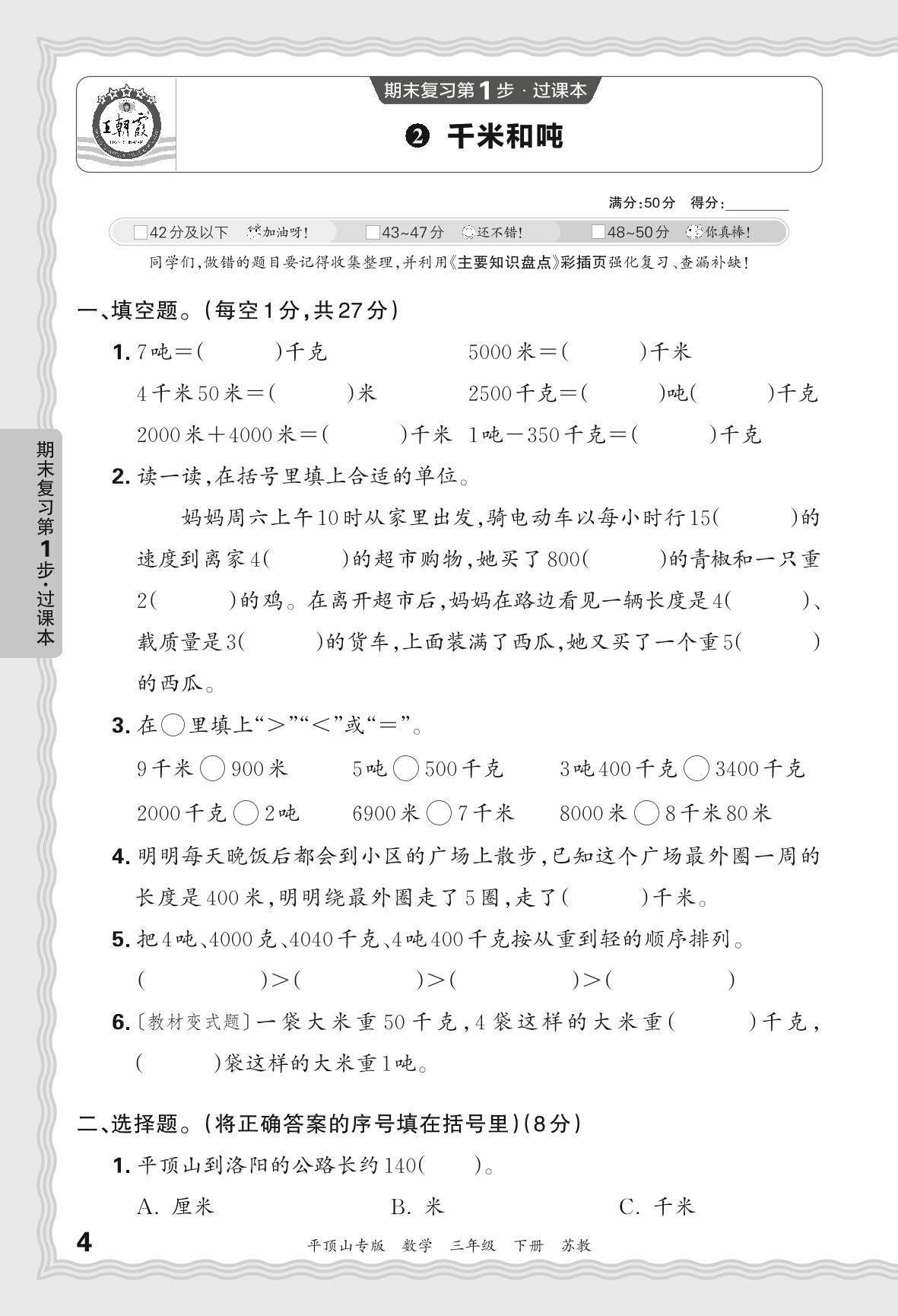 2024春下册三年级数学苏教版 期末过课本平顶山版·千米和吨【2】