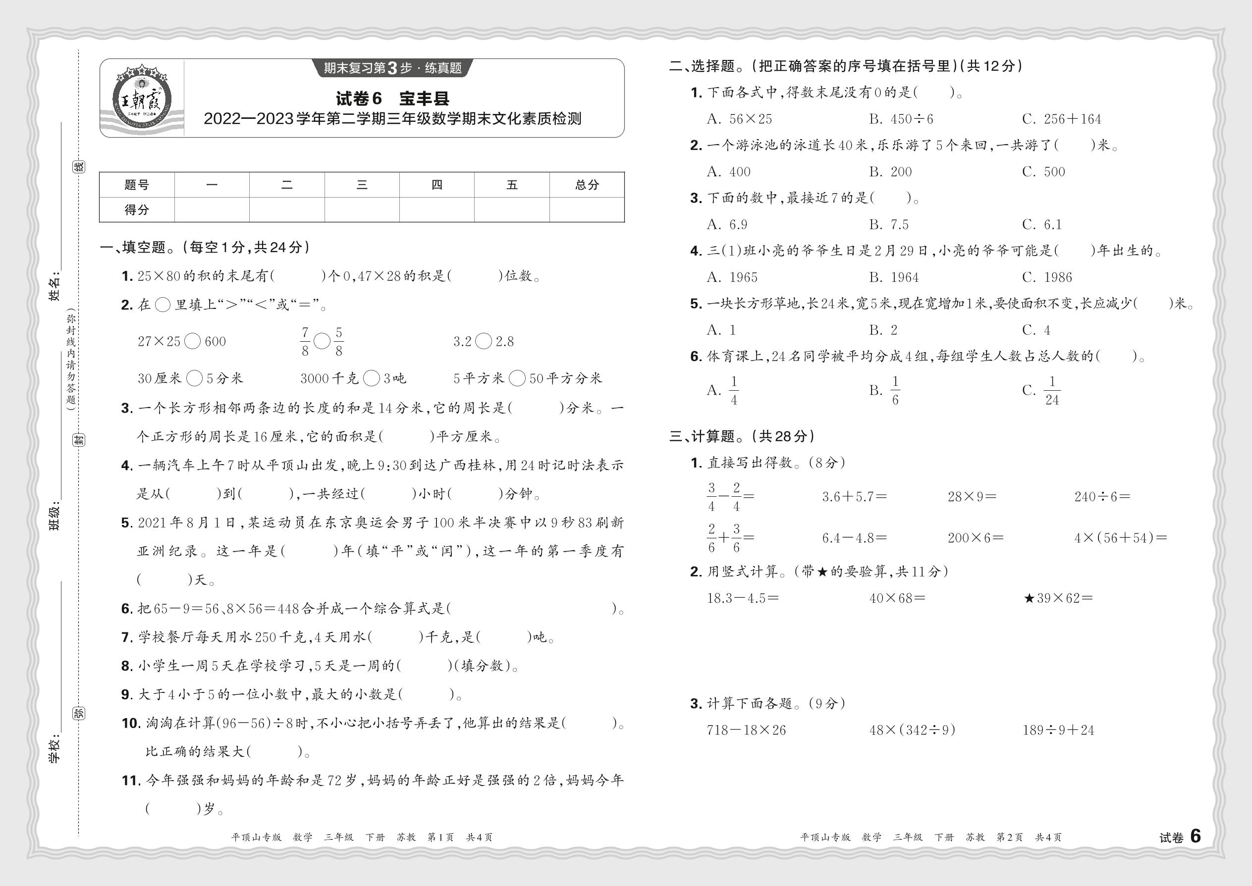 河南省平顶山市宝丰县2022-2023学年第二学期三年级数学期末文化素质检测(苏教版)【6】