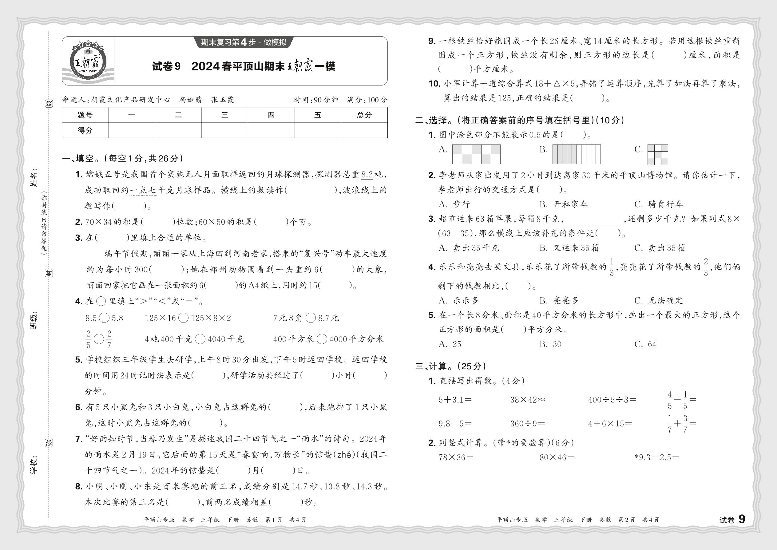 2024春下册三年级数学苏教版 河南平顶山期末王朝霞一模【9】