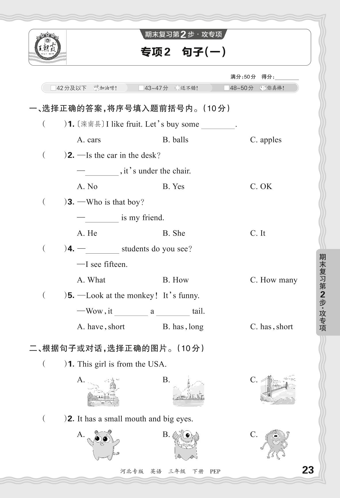 2024春下册三年级英语人教PEP版 期末专项卷河北版·句子(一)【2】