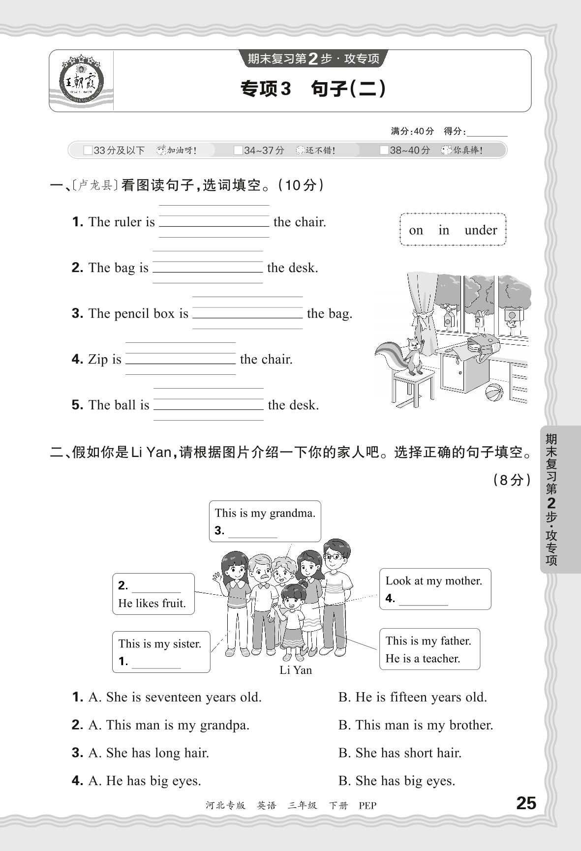 2024春下册三年级英语人教PEP版 期末专项卷河北版·句子(二)【3】