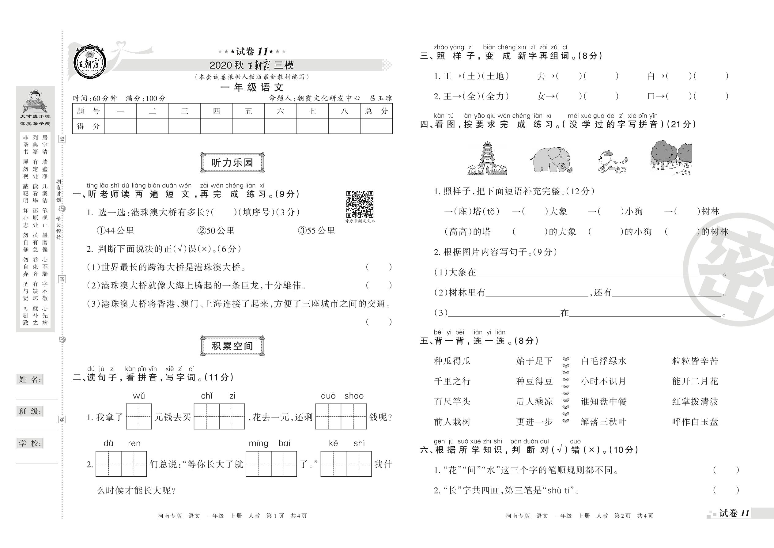 王朝霞期末模拟卷一年级上册语文(人教版)_R210731173825【11】