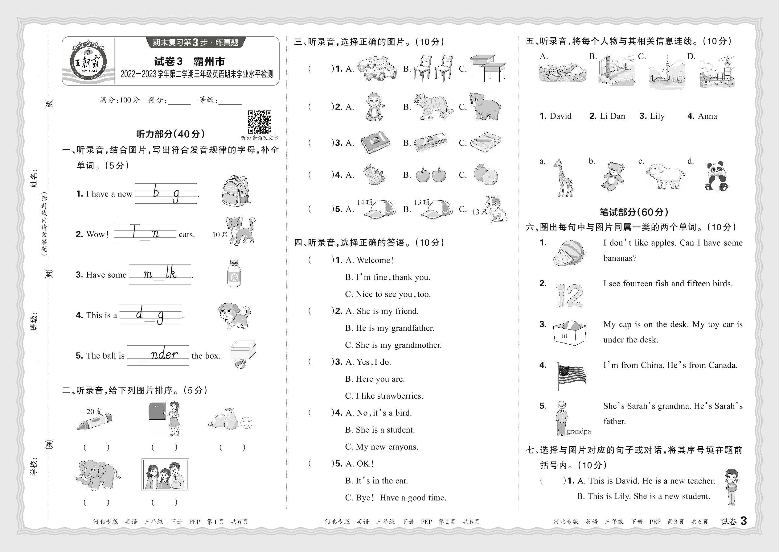 河北省廊坊市霸州市2022—2023学年第二学期三年级英语期末学业水平检测(人教PEP版)【3】