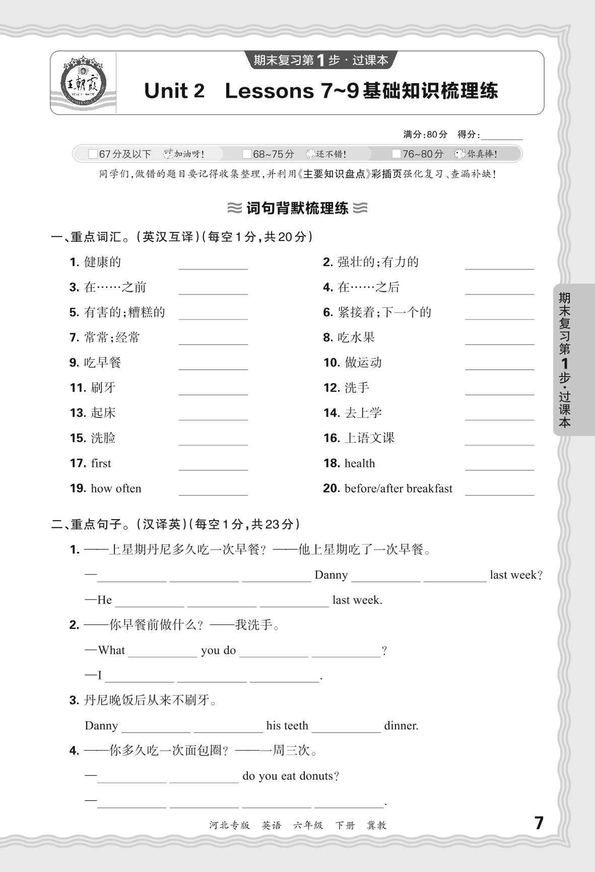 2024春下册六年级英语冀教版 期末过课本河北版·Unit 2 Lessons 7~9 基础知识梳理练