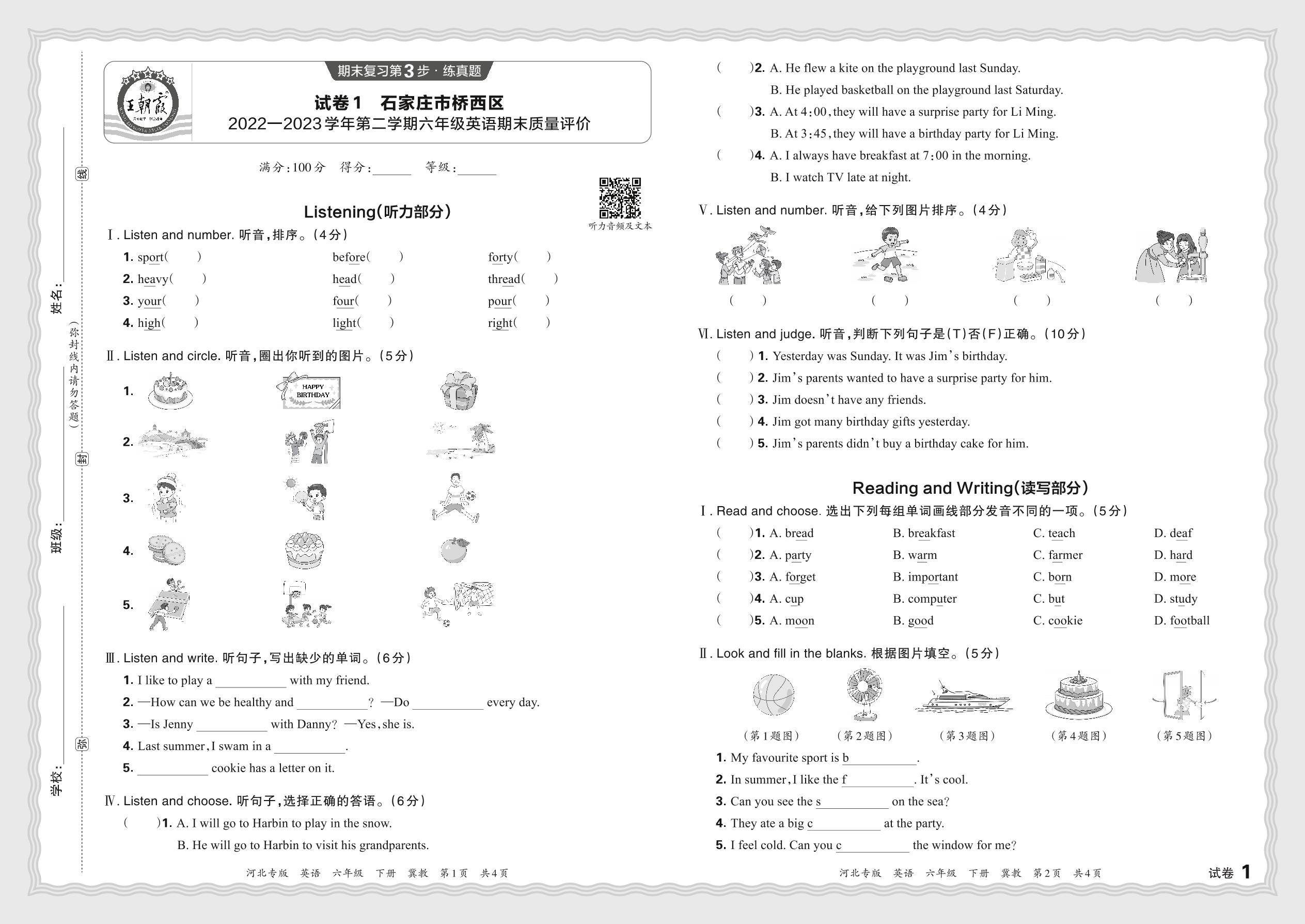六年级英语冀教版下册期末卷