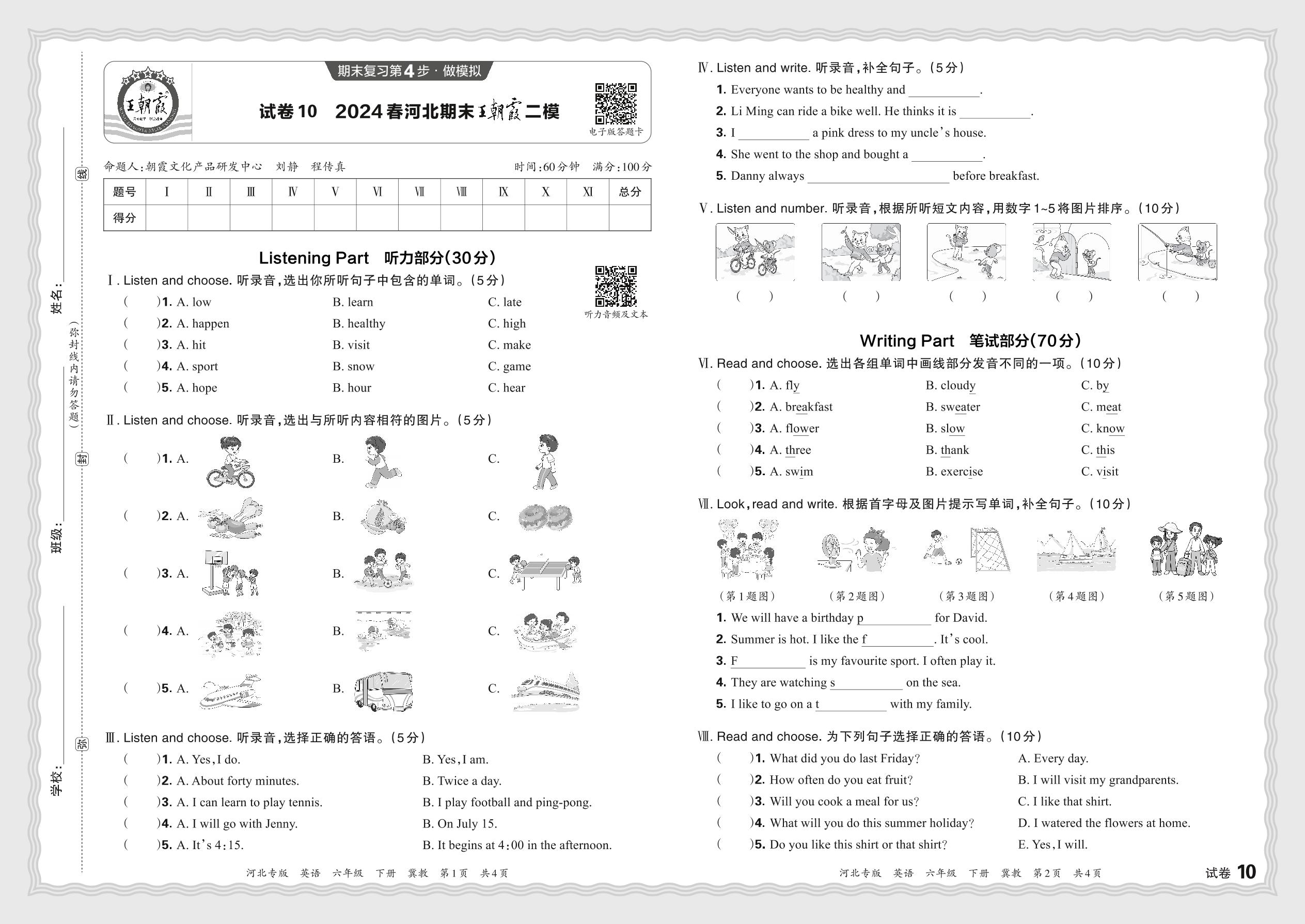 2024春下册六年级英语冀教版 河北期末王朝霞二模