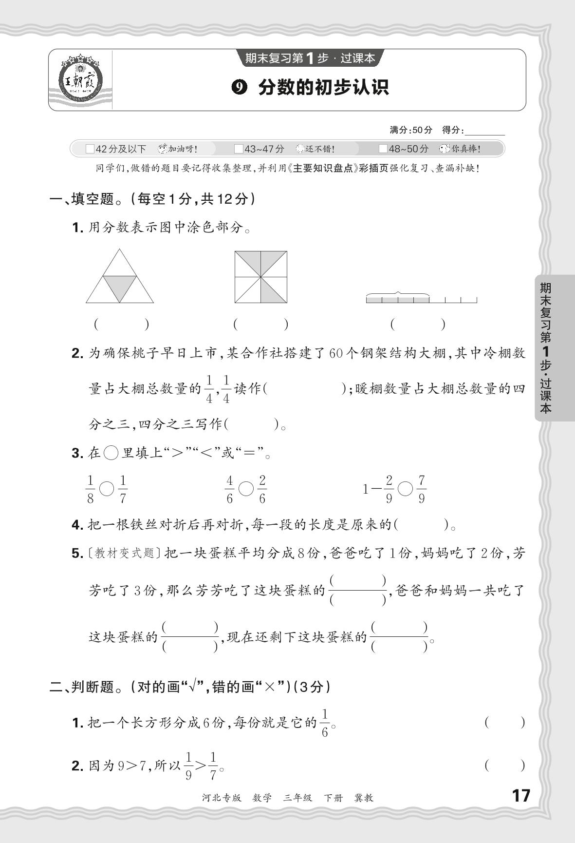 2024春下册三年级数学冀教版 期末过课本河北版·分数的初步认识【9】