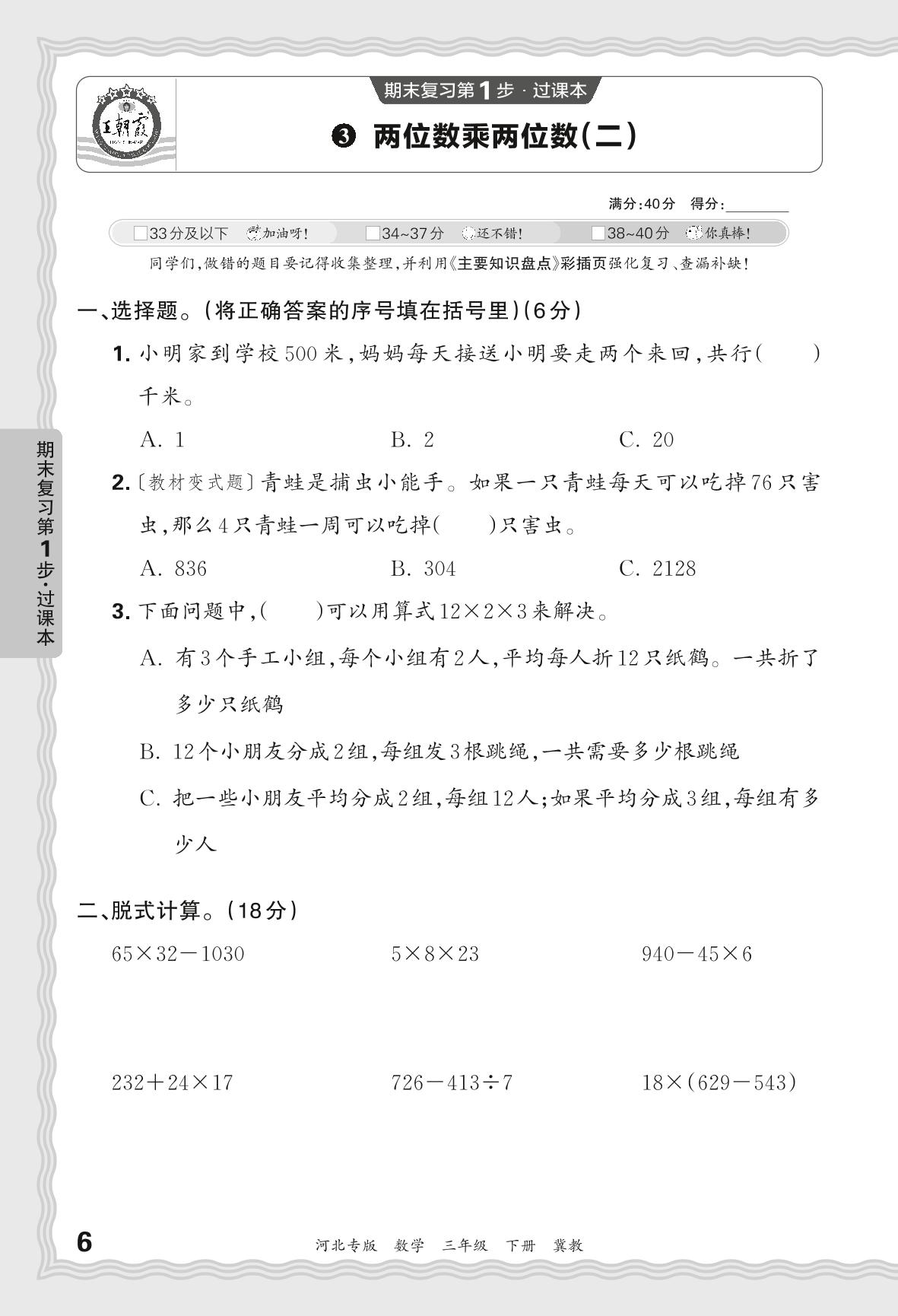 2024春下册三年级数学冀教版 期末过课本河北版·两位数乘两位数(二)【3】