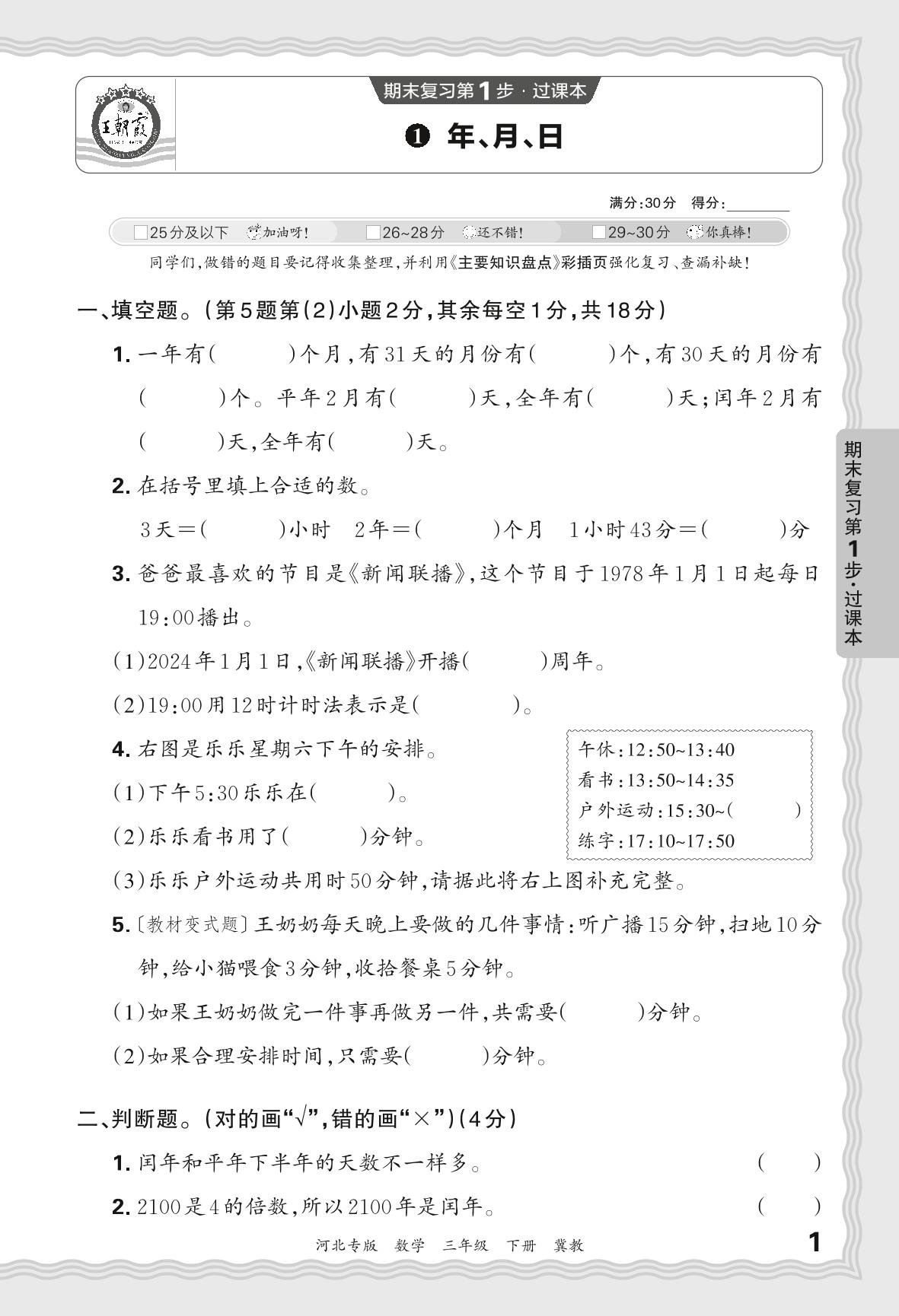 2024春下册三年级数学冀教版 期末过课本河北版·年、月、日【1】