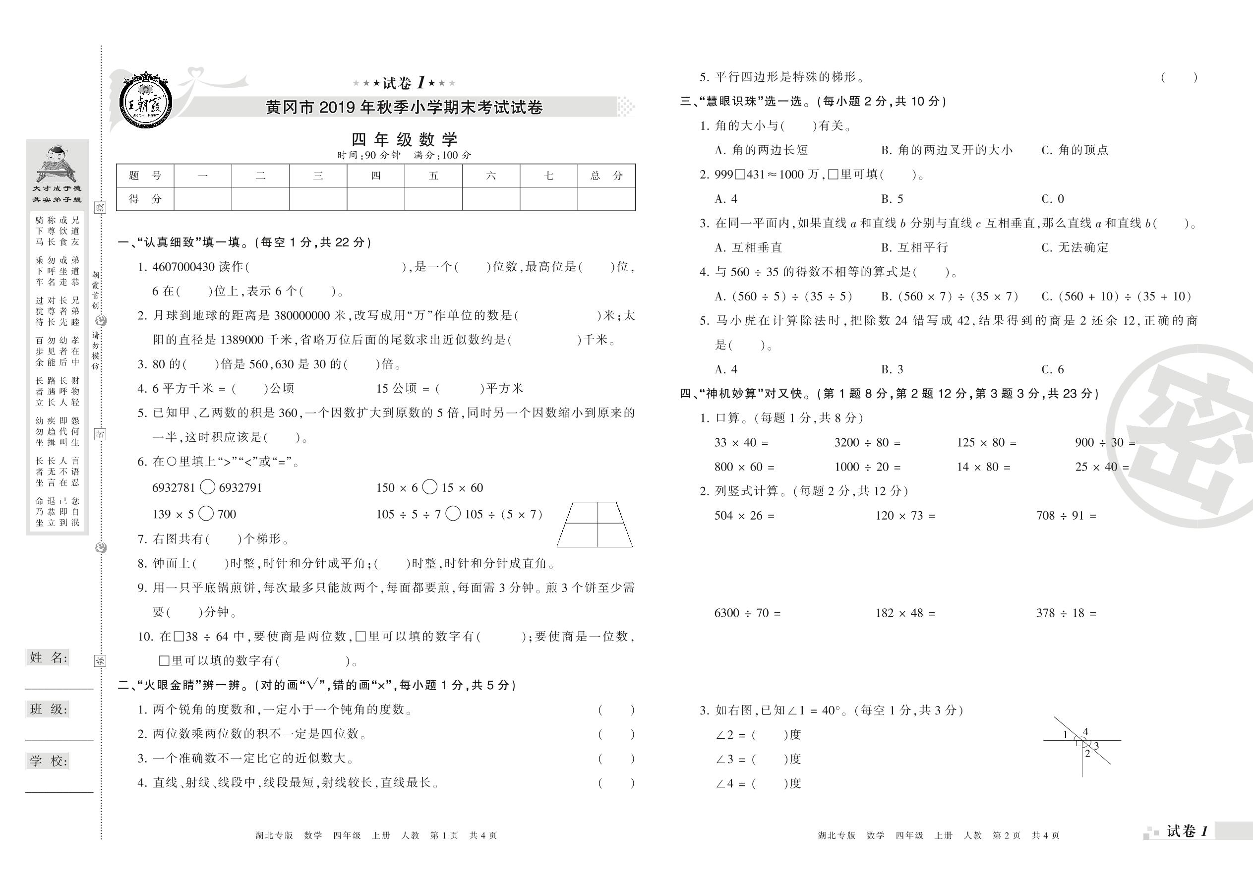 2019-2020学年第一学期黄冈市四年级数学试卷(人教版)【1】