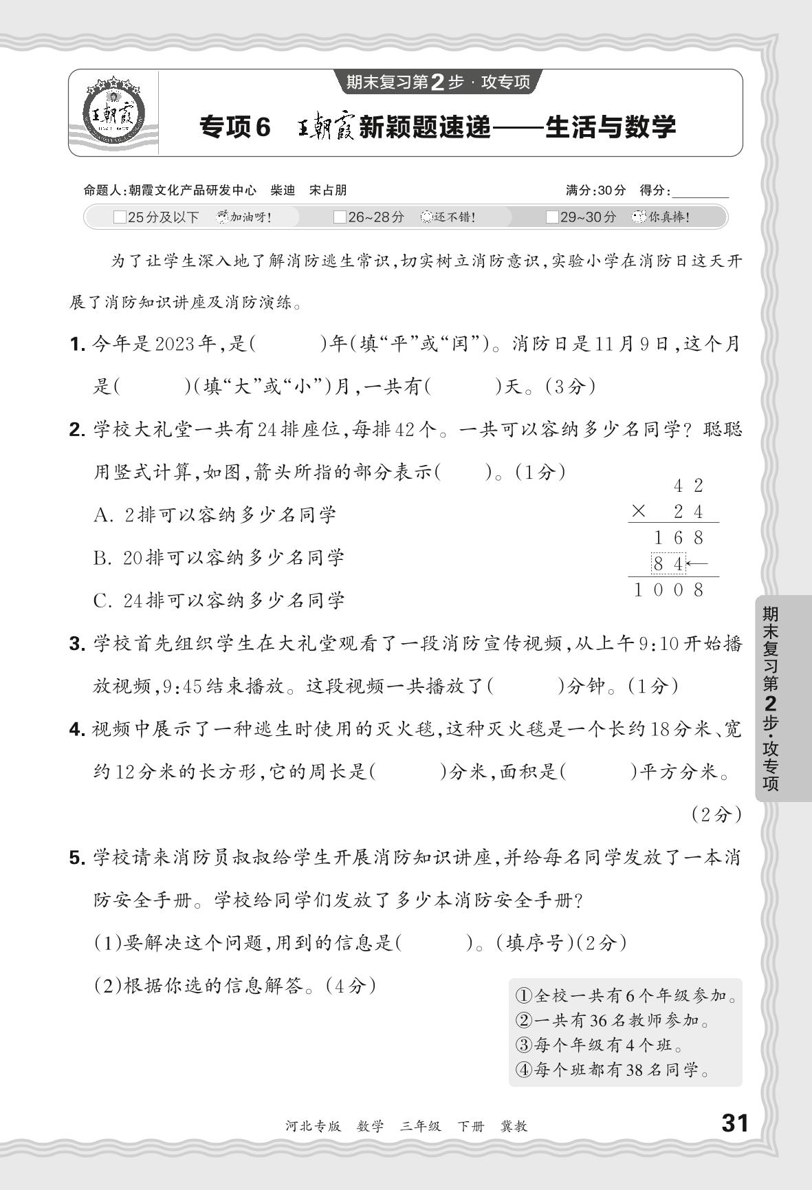 2024春下册三年级数学冀教版 期末专项卷河北版·王朝霞新颖题速递——生活与数学【6】