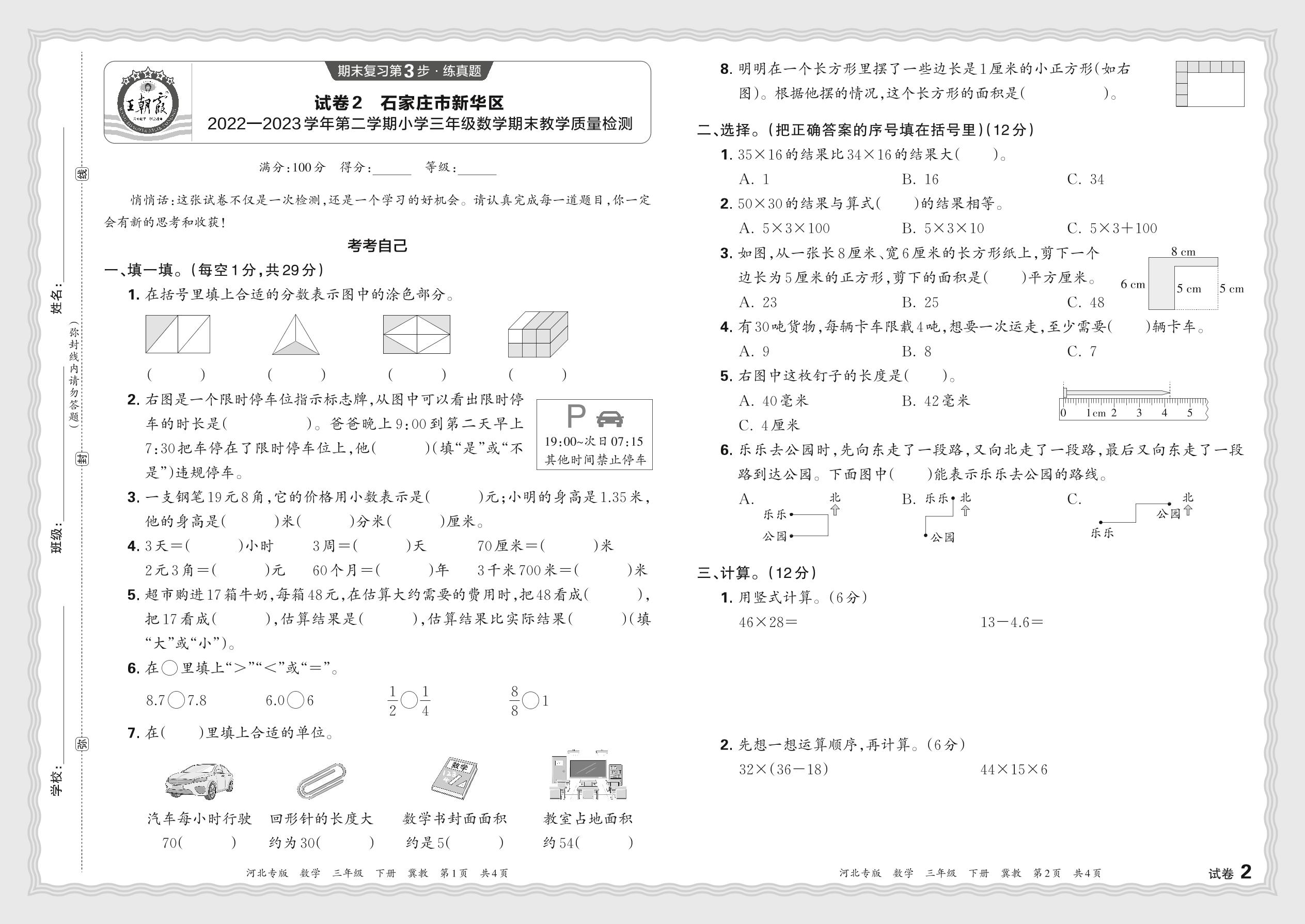 河北省石家庄市新华区2022—2023学年第二学期小学三年级数学期末教学质量检测(冀教版)【2】