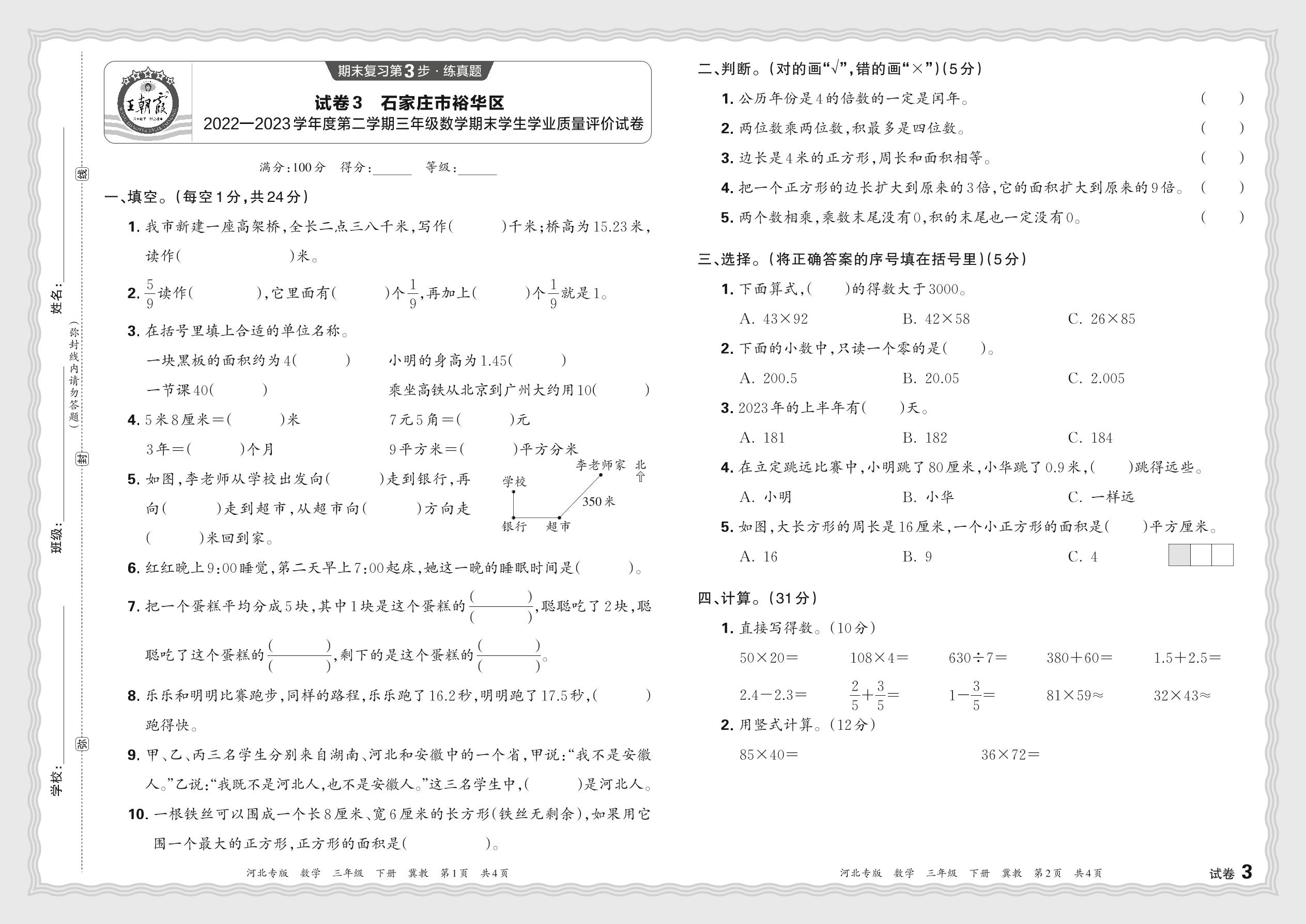 河北省石家庄市裕华区2022—2023学年第二学期三年级数学期末学生学业质量评价试卷(冀教版)【3】