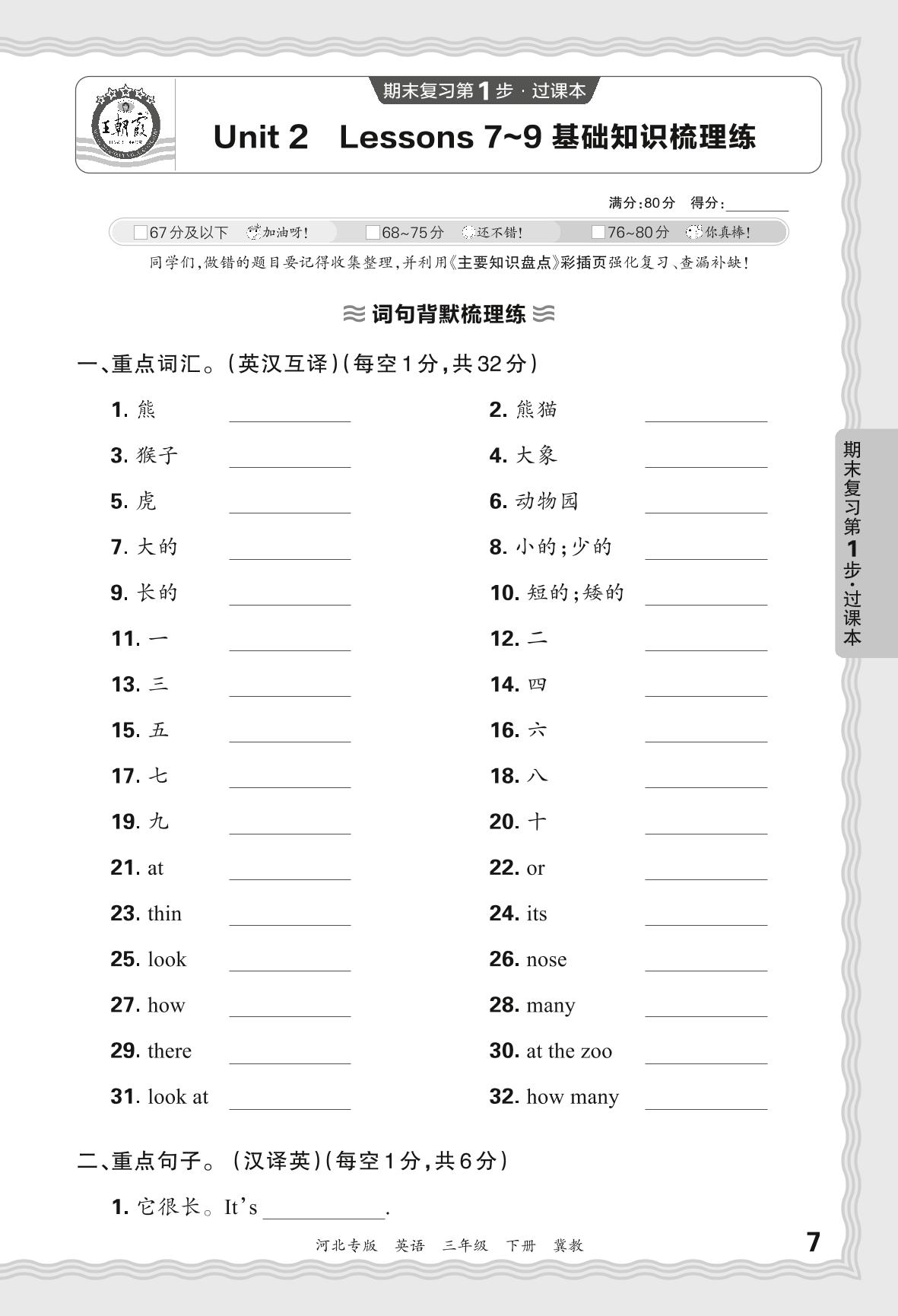2024春下册三年级英语冀教版 期末过课本河北版·Unit 2 Lessons 7~9 基础知识梳理练