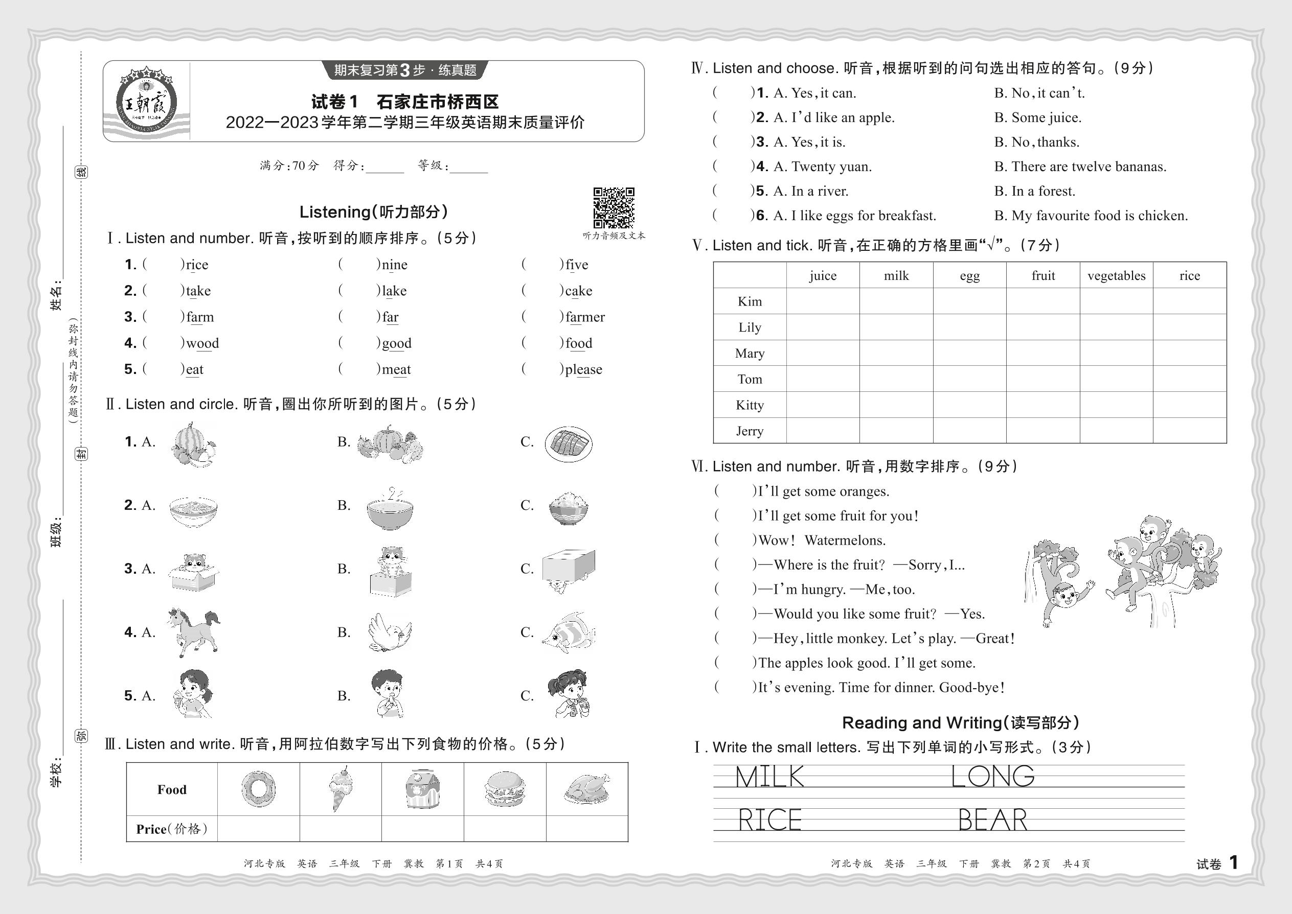 河北省石家庄市桥西区2022—2023学年第二学期三年级英语期末质量评价(冀教版)【1】