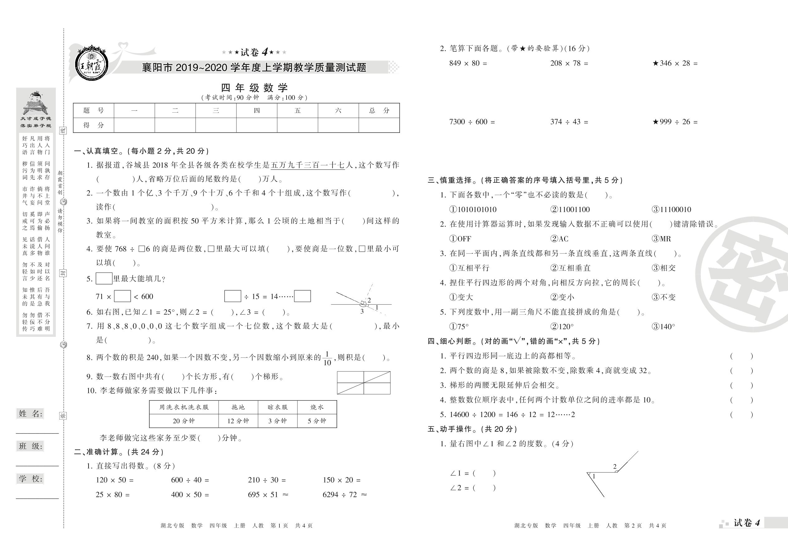 2019-2020学年第一学期襄阳市四年级数学试卷(人教版)【4】