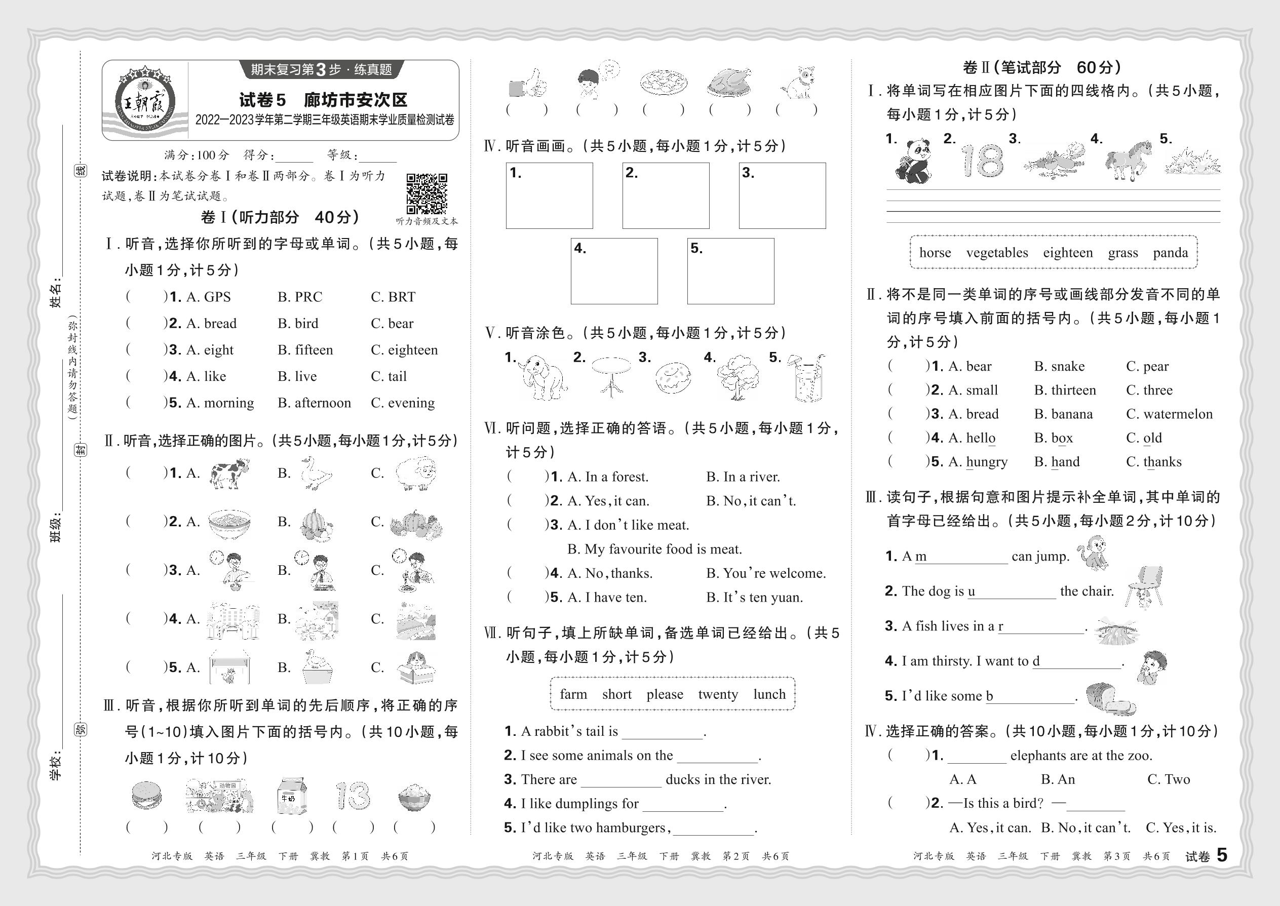河北省廊坊市安次区2022—2023学年第二学期三年级英语期末学业质量检测试卷(冀教版)【5】