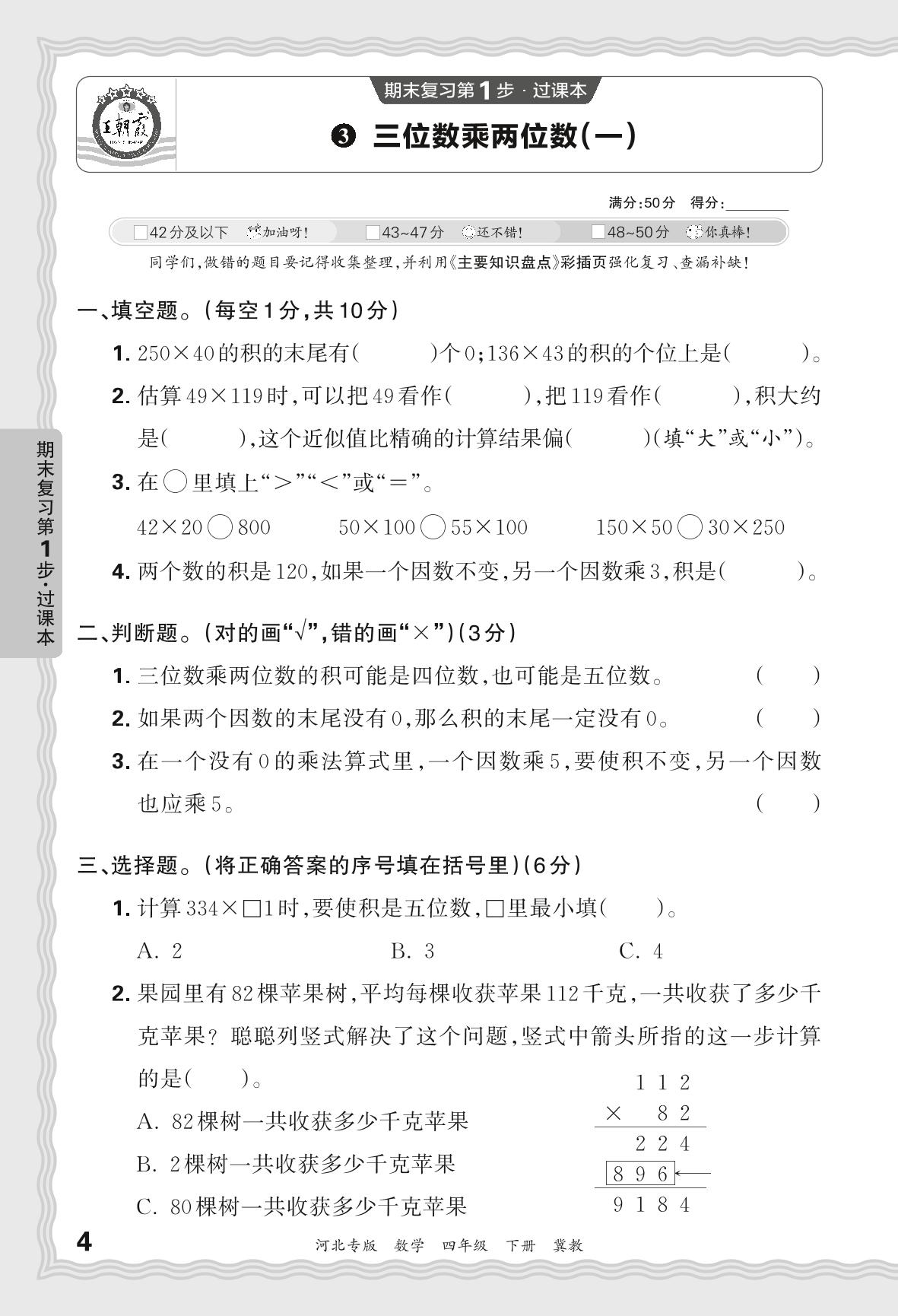 2024春下册四年级数学冀教版 期末过课本河北版·三位数乘两位数(一)【3】