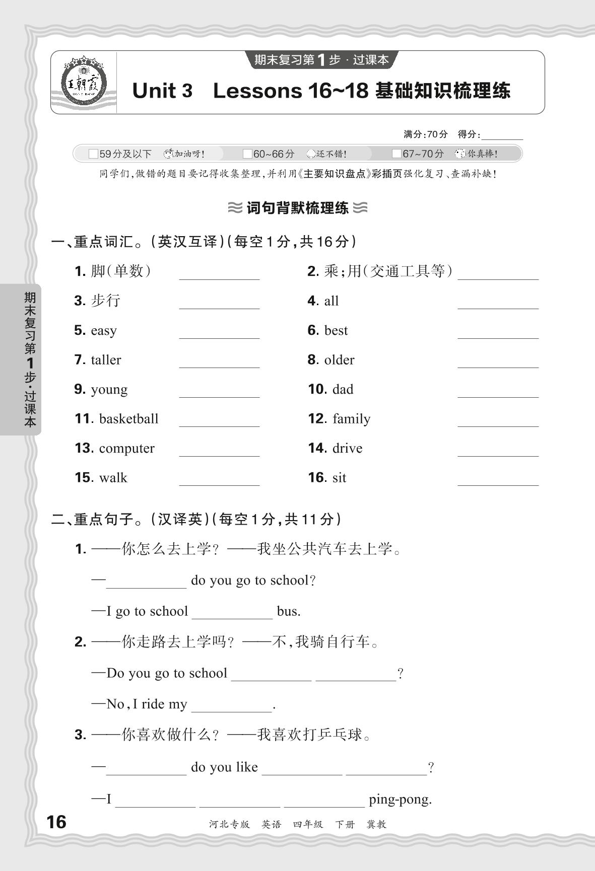 2024春下册四年级英语冀教版 期末过课本河北版·Unit 3 Lessons 16~18 基础知识梳理练