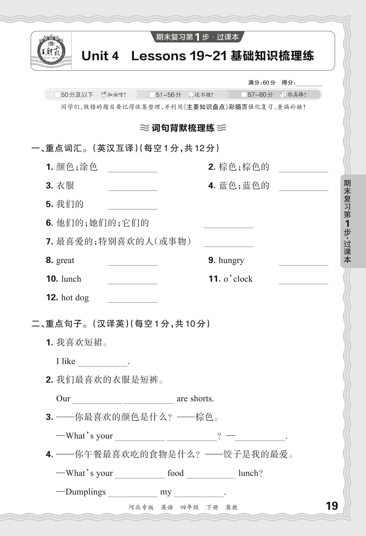 2024春下册四年级英语冀教版 期末过课本河北版·Unit 4 Lessons 19~21 基础知识梳理练
