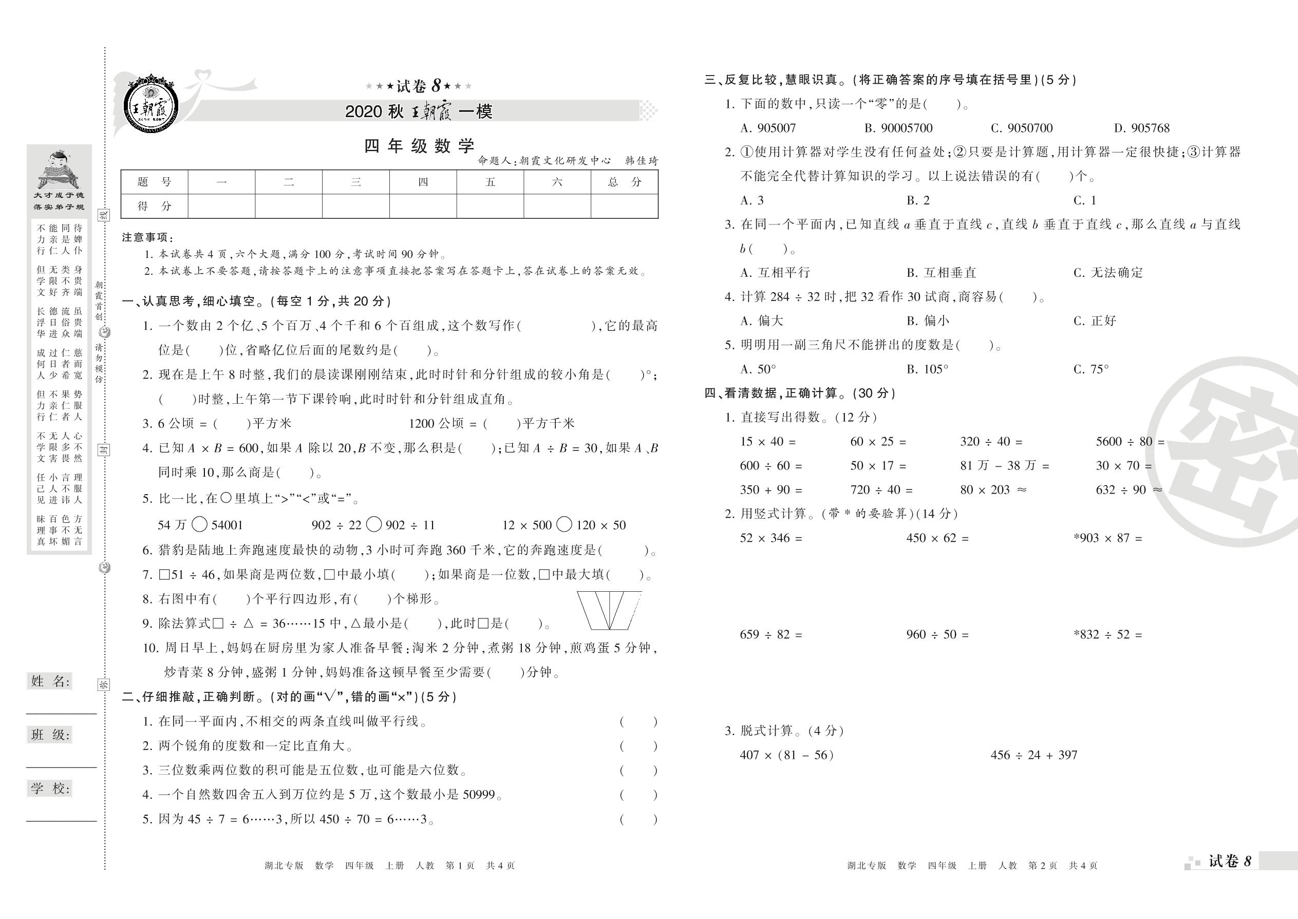 王朝霞期末模拟卷四年级上册数学(人教版)_R210804141513【8】